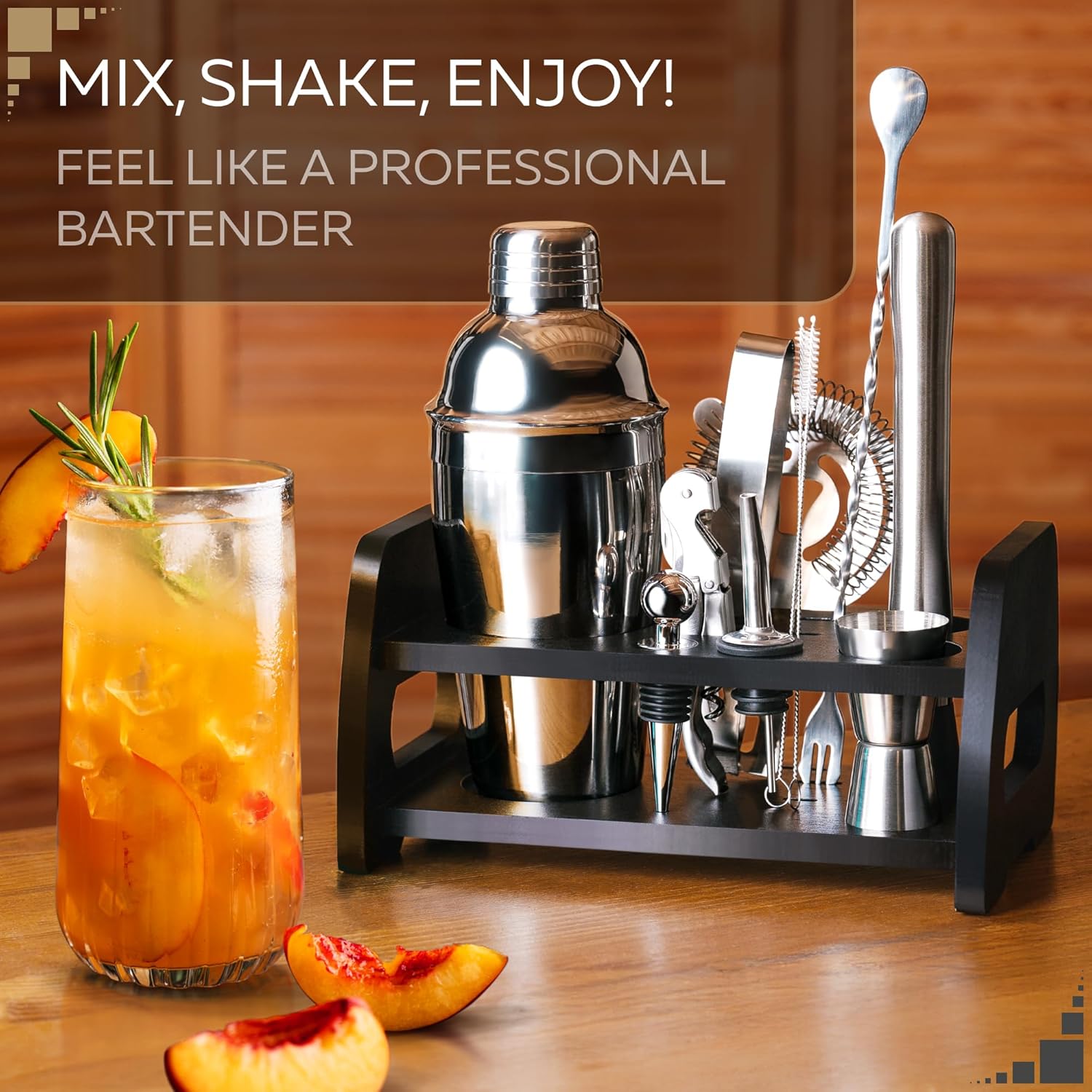12 TOOLS INCLUDED: This bartender kit comes with the following tools: 550 ml Shaker, Jigger, Ice Tong, Bar Spoon, Strainer, Corkscrew, Wine Pourer, Wine Stopper, 2 x Brash, Muddler, Recipe Book, Wooden Black Stand.