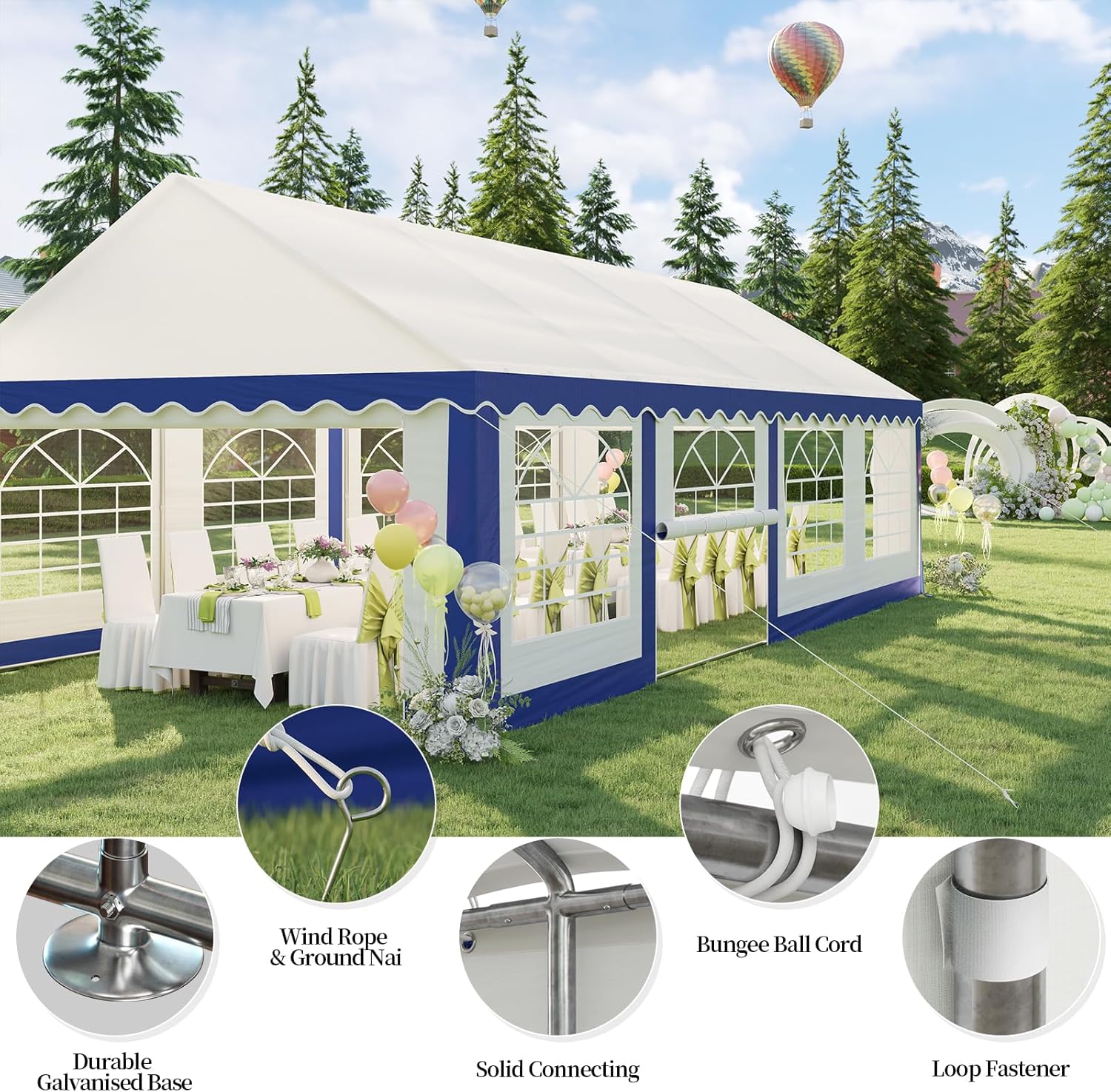 【Versatile Usage】Ideal for both recreational and commercial events, the party tent is perfect for weddings, baby showers, carports, and trade fairs. Its striking white and blue design adds a distinctive touch to any celebration
