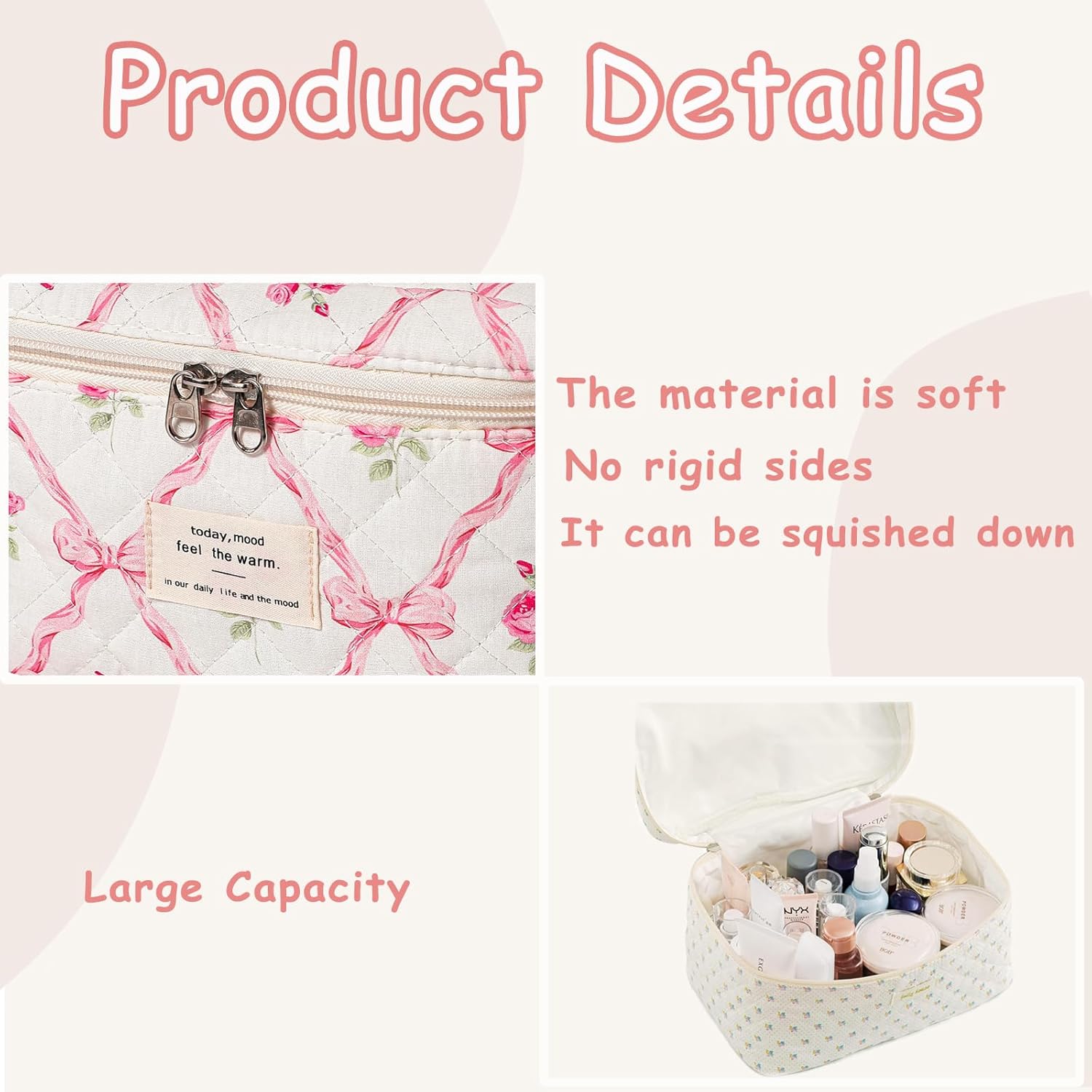 Our quilted cosmetic bag is made of high-quality cotton,it is soft and can be squished down, more durable and scratch-resistant.There’s no structure to the sides but it holds its shape with the contents you store inside. Floral print is super cute and clear.