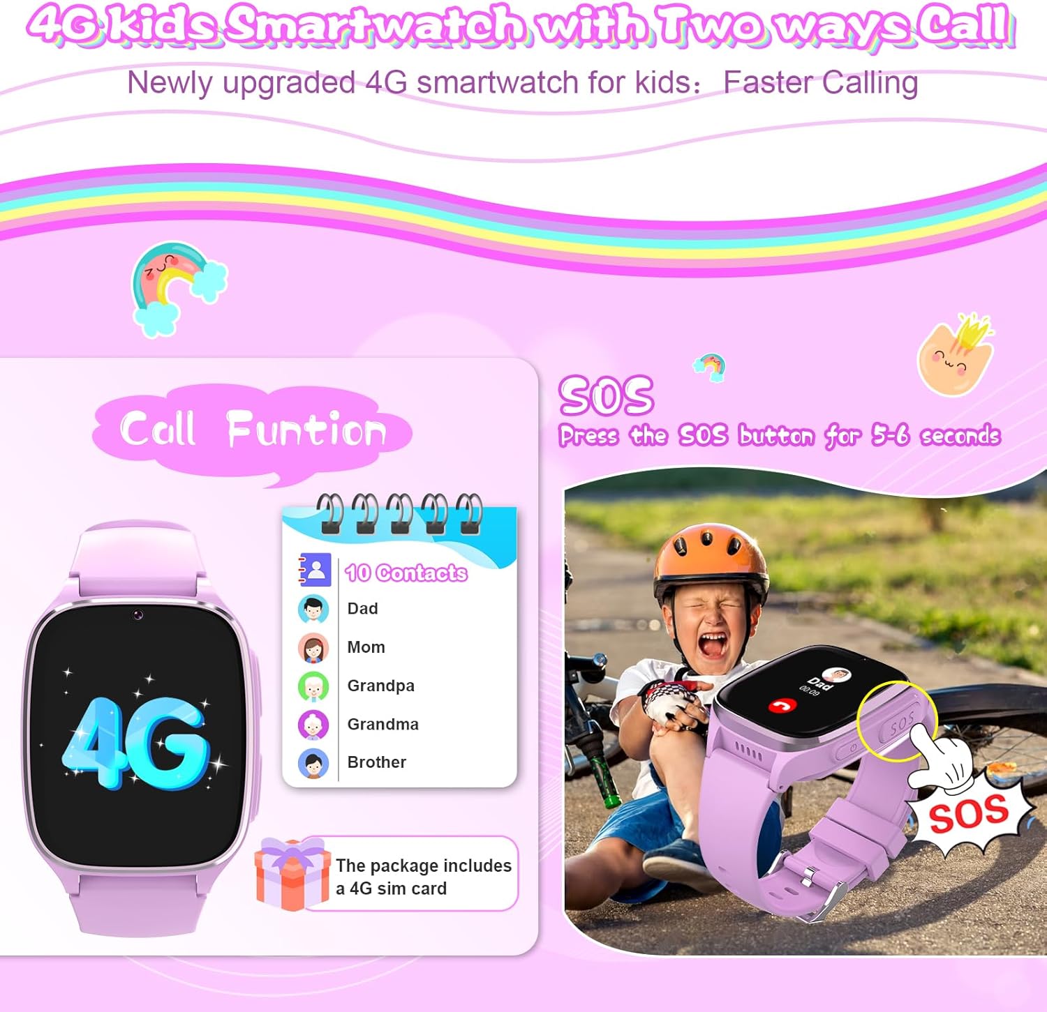 【Newly upgraded 4G children’s smartwatch with calling (NO GPS or Texting)】: Kids smartwatch has call function, and a 4G SIM card is included in the package. You only need to activate the SIM card to use the call function, and all applications are included in the children’s watch, which is convenient and easy to operate.