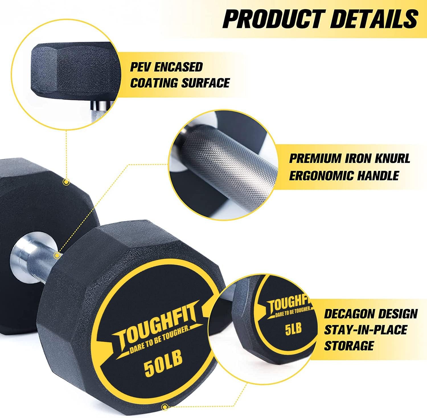【Easy Grip Knurled Handles】- ToughFit Decagon Dumbbell features straight and knurled handles with a 1.27″ diameter for easy grip, even when sweat or weight slips off.