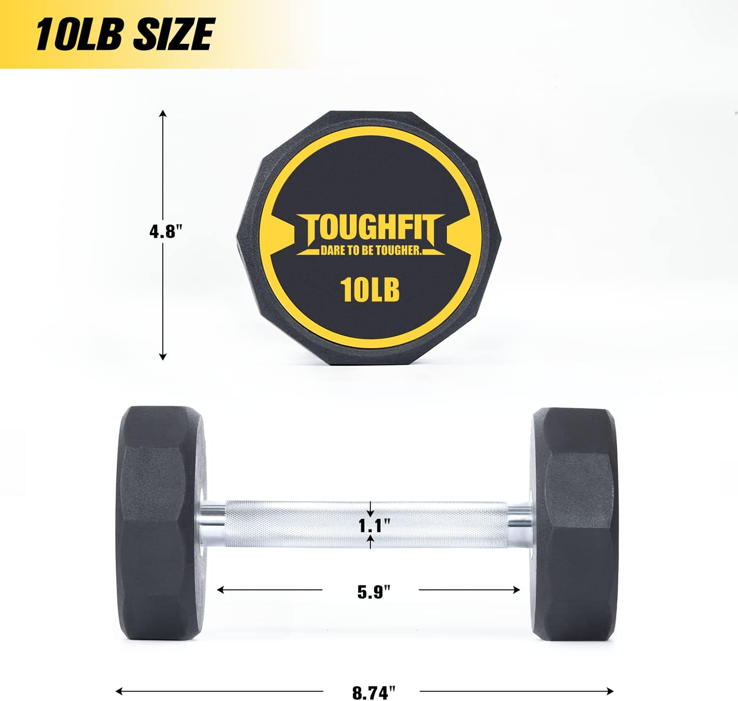 【Easy Grip Knurled Handles】- ToughFit Decagon Dumbbell features straight and knurled handles with a 1.27″ diameter for easy grip, even when sweat or weight slips off.
