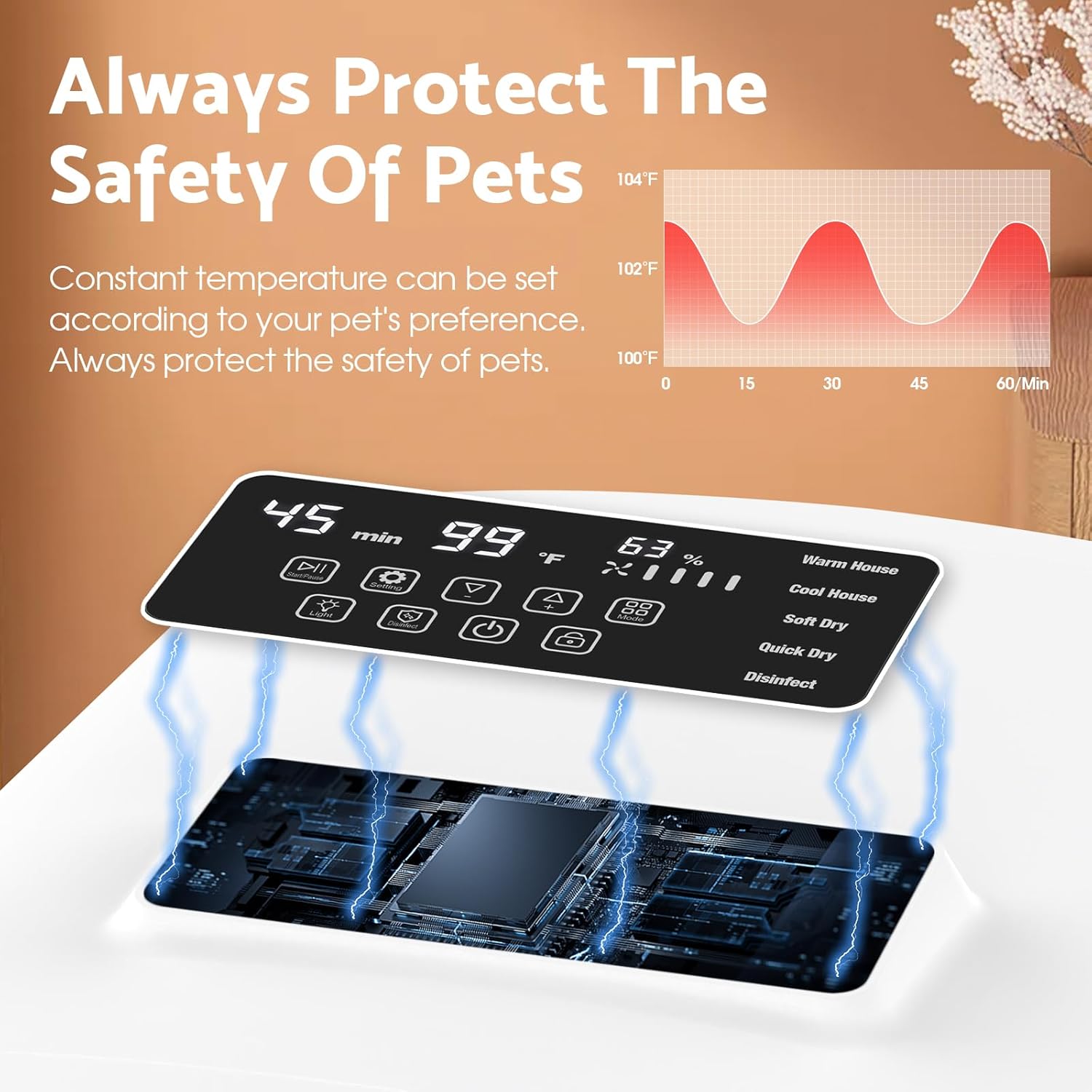 【Drying Safety】Equipped with a precision temperature sensor, PTC heat dissipation protection, a safety power-off switch, an air duct fan temperature sensor, and a temperature control fuse, our smart pet dryer prioritizes safety to provide a secure and reliable drying experience for your pet.
