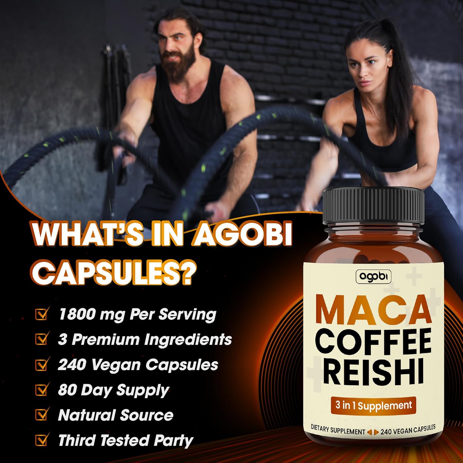 agobi 1800mg Maca Coffee Supplement with Reishi Mushroom – 240 Vegan Capsules – Support for Energy Production, Mood Support, Immune System & Stamina – Gluten-Free, Non-GMO