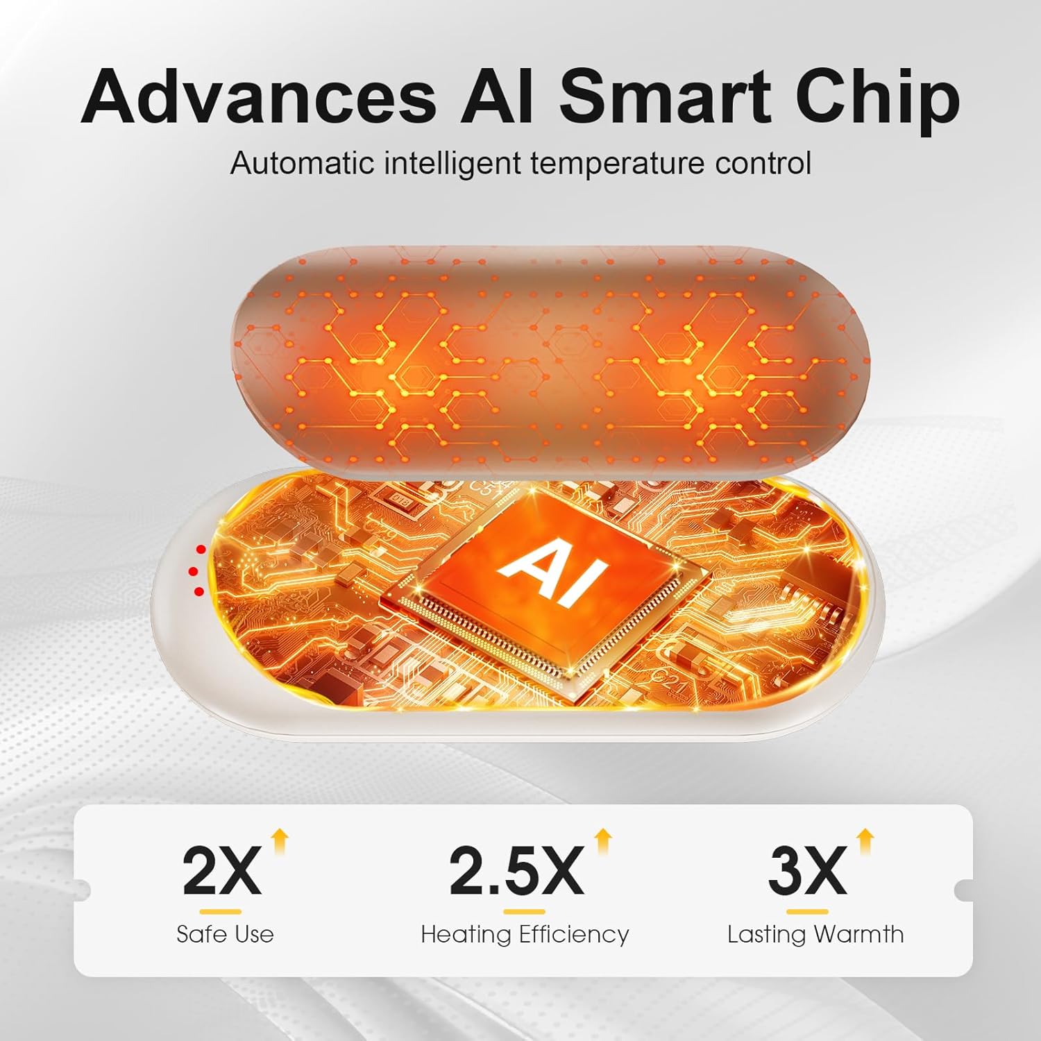 AI Temperature Sensor Chip – Our electric hand warmer features an integrated smart AI temperature control chip that provides precise 3-level heat regulation, feedback, and monitoring. By continuously analyzing and detecting the temperature between the hand warmer and your hands, it ensures precise heat control for optimal comfort and safe heating, with a maximum temperature of 131℉