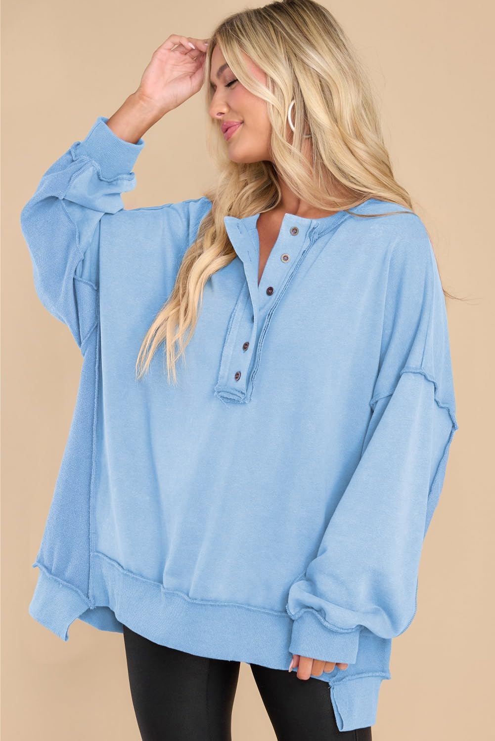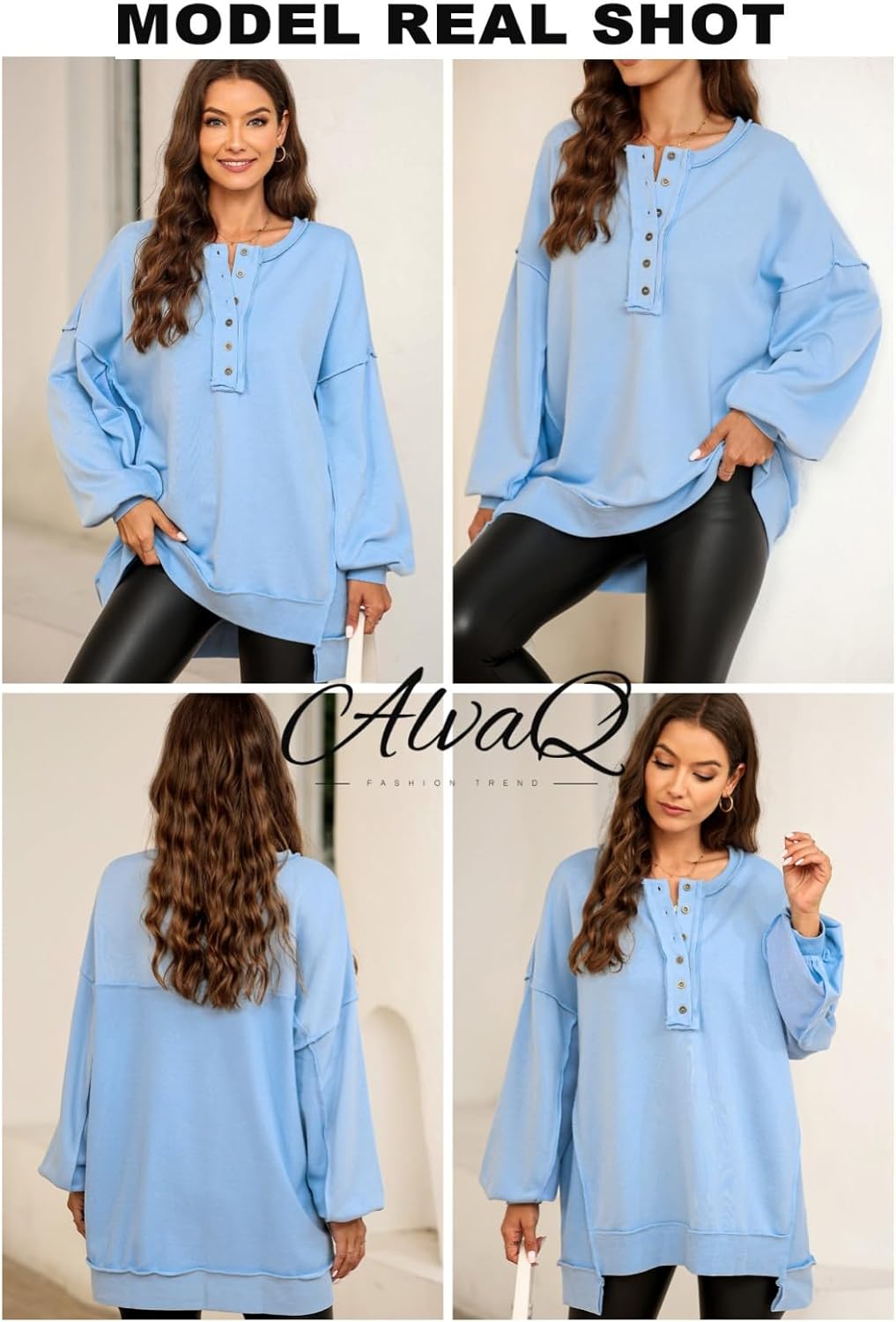 AlvaQ Women’s Oversized Sweatshirt Casual Long Sleeve Button Henley Neck Pullover Tunic Tops Outfits