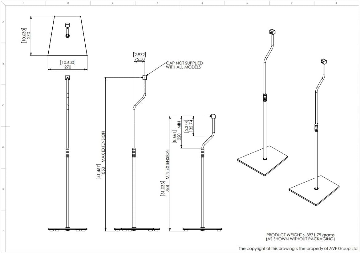 The AVF EAK85B-A is a pair of black speaker floor stands. The black glass bases are sleek and stylish, while the easy height adjustment allows ideal placement for appearance and sound quality. EAK85B-A supports up to 11 lbs per stand, and offers multiple speaker mounting options.