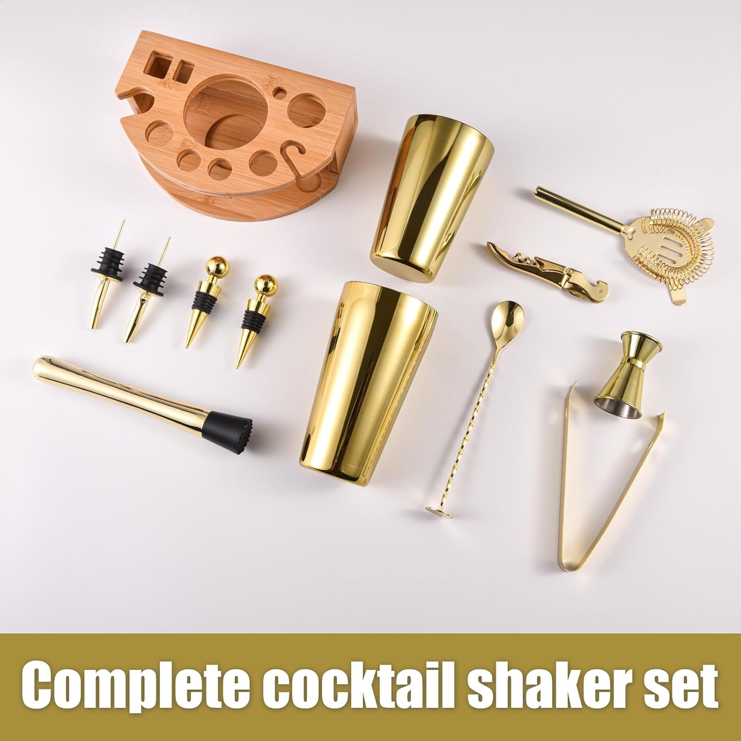 【12 Piece Complete Cocktail Kit】: The cocktail shaker set is the best tool for bartenders to make a wide variety of party cocktail or bar mixed drink. Include 20oz/25oz Cocktail Shaker, 15/30ml Double Jigger, Strainer, Ice Tongs, Muddler, Spoon, Liquor Pourers*2, Bottle Stopper*2, Wine Opener, Bamboo Stand, Cocktail Recipes Booklet.