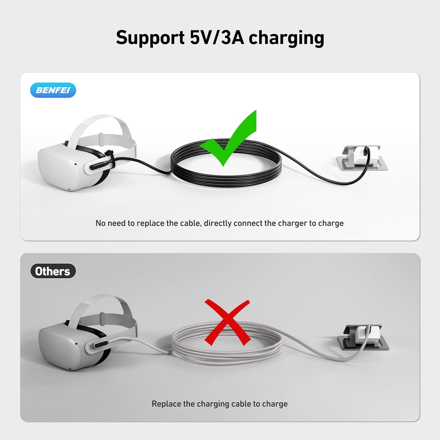QC 18W charging with 15ft cable: To ensure the QC charging requirements of VR devices, BENFEI adopts 5V 3A specifiction cable to guarrante enough charging current in 15 feet length, no decrease or damage to VR devices.