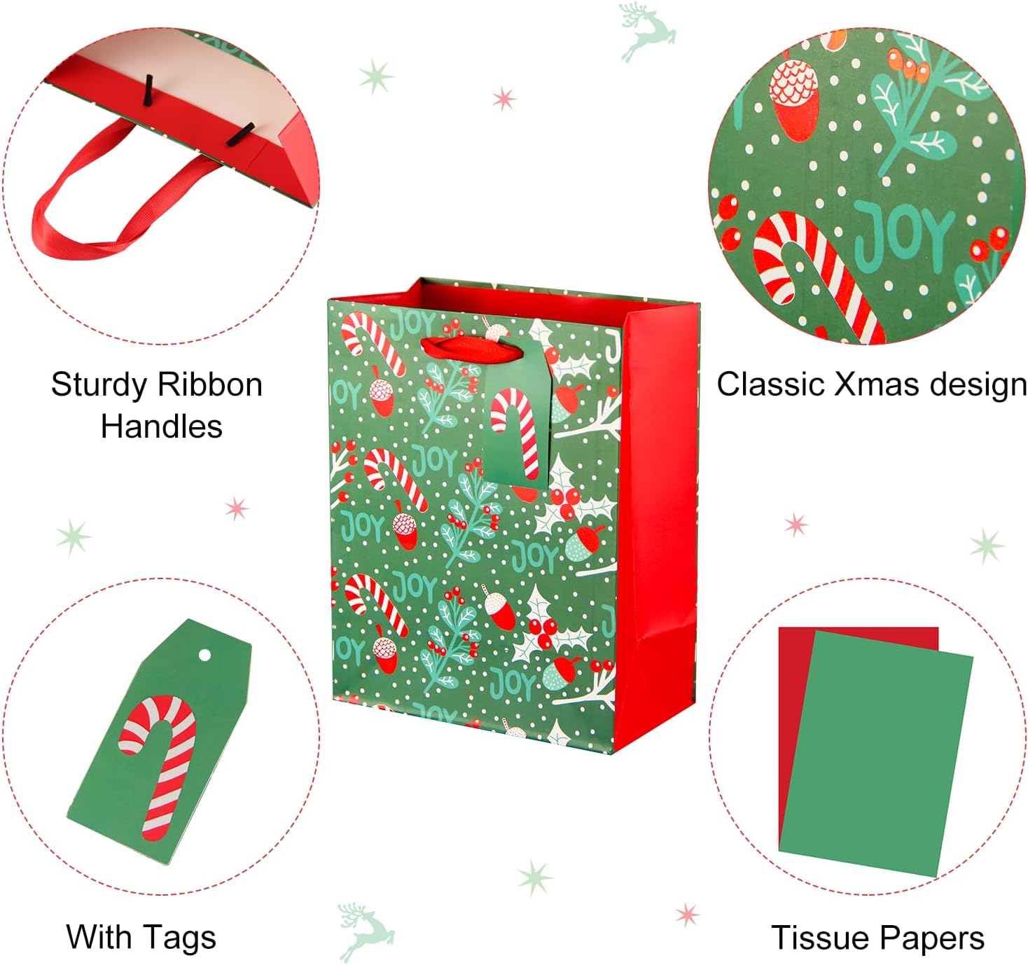 Ideal Gift bags for Christmas: Suitable for packing Christmas gifts–especially used as treat bags, candy bags, storage bags, party bags, Christmas decorations, secret Santa gift exchanges, etc. These Xmas gift bags are ideal for most Christmas gift packaging.