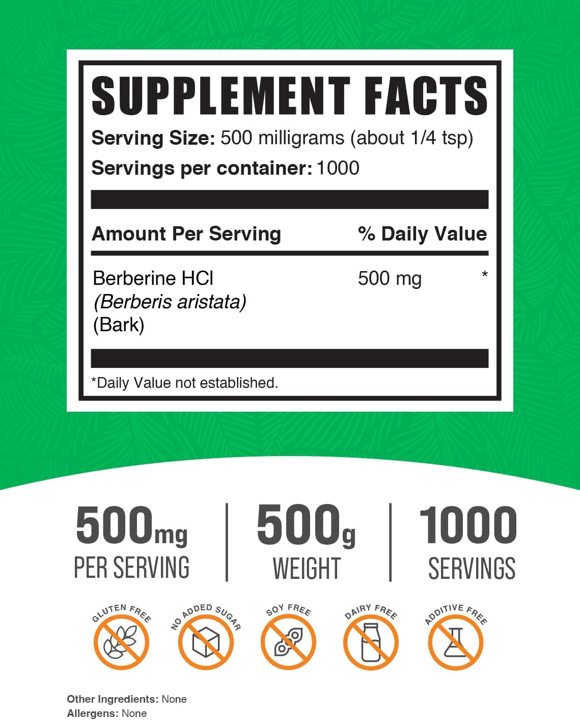 BulkSupplements.com Berberine HCl Powder – Berberine Supplement, Berberine 500mg, Berberine Powder – Gluten Free, 500mg per Serving, 500g (1.1 lbs) (Pack of 1)