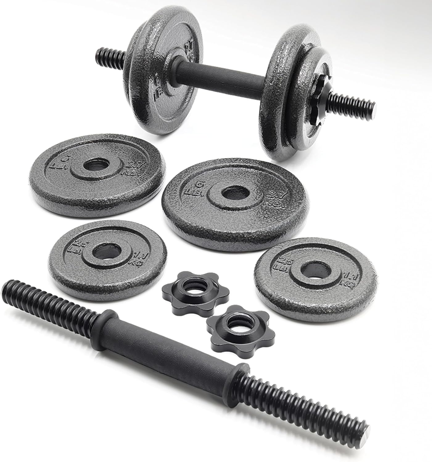 Fully adjustable with four 6 lb plates, four 2.5 lb plates, 2 threaded solid dumbbell handles, and 4 spin-lock collars.