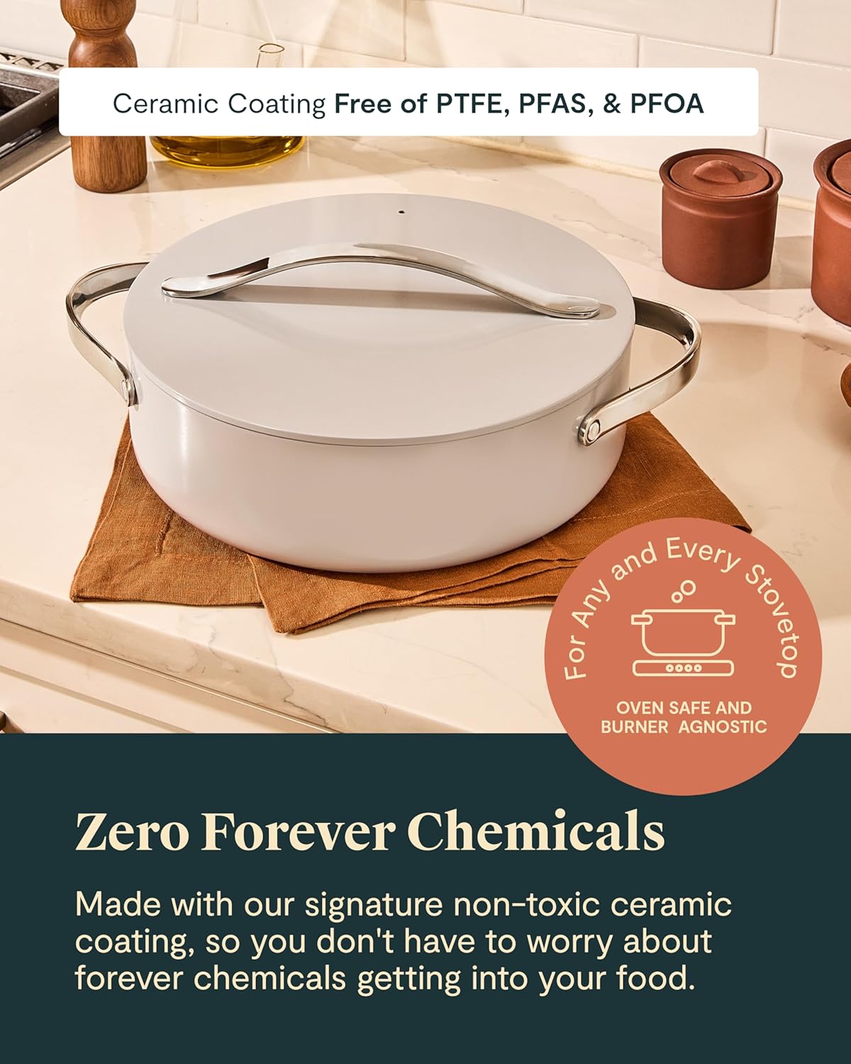 NON-TOXIC CERAMIC COATING: Cook with confidence knowing our Rondeau saute pan is free from forever chemicals and other harmful materials. Our signature ceramic coating ensures your food remains safe and delicious.