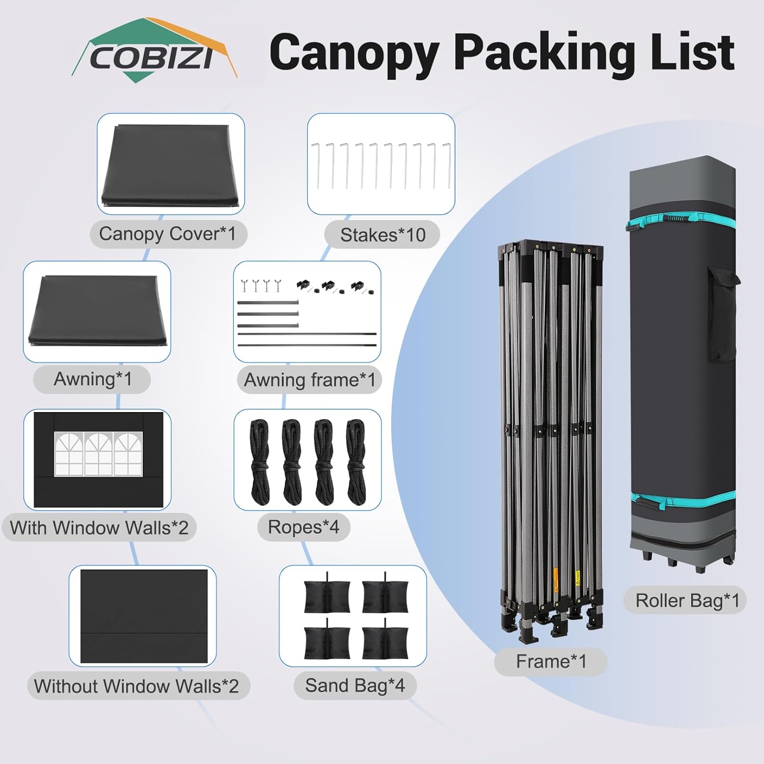 【Packing List & After-sales Service】COBIZI canopy with awning includes: frame x 1, awning x 1, awning bracket x 1, sidewall x 4, sandbag x 4, rope x 4, floor nail x 10, roller bag x 1. We are willing to provide you with good after-sales. If you have questions about the product during use, you are welcome to contact us