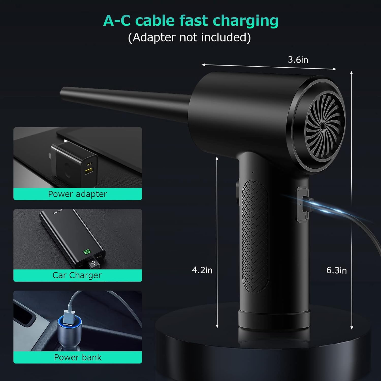 Air duster – USB Charging Design: Electric air duster battery protection design, Do not charge when the machine just finished using, the battery temperature is too high, please wait ten minutes to cool down before charging.
