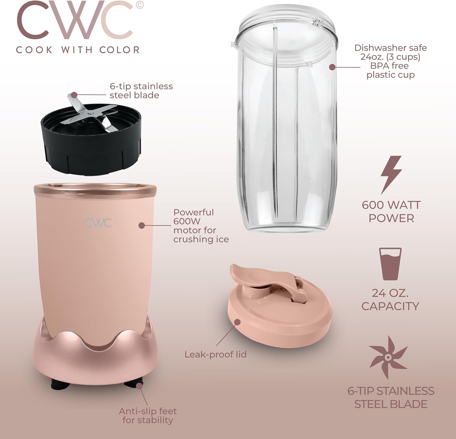 COOK WITH COLOR Personal Power Blender 600W, 24oz Capacity, BPA-Free Jar, Ice-Crushing Blades, Ideal for Smoothies & More, Anti-Slip Feet, Easy to Clean, Dusty Rose