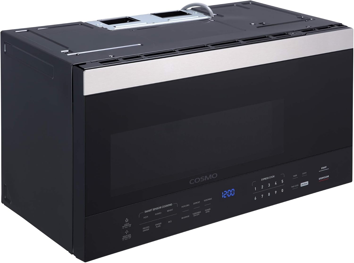 Maximize your Kitchen space with this Cosmo Over-the-Range microwave also equipped to clear the air as a range hood. 1000 Watts of cooking power allows you to cook your favorite foods quickly and thoroughly. The touch of a key is all it takes to prepare your favorite meals and snacks with 10 power levels for plenty of options. Other unique features, such as a sleek easy-to-read digital display, high-quality lighting for better visibility, and sensor reheat, and cooking technology. The hinge is present on the left side of the microwave.