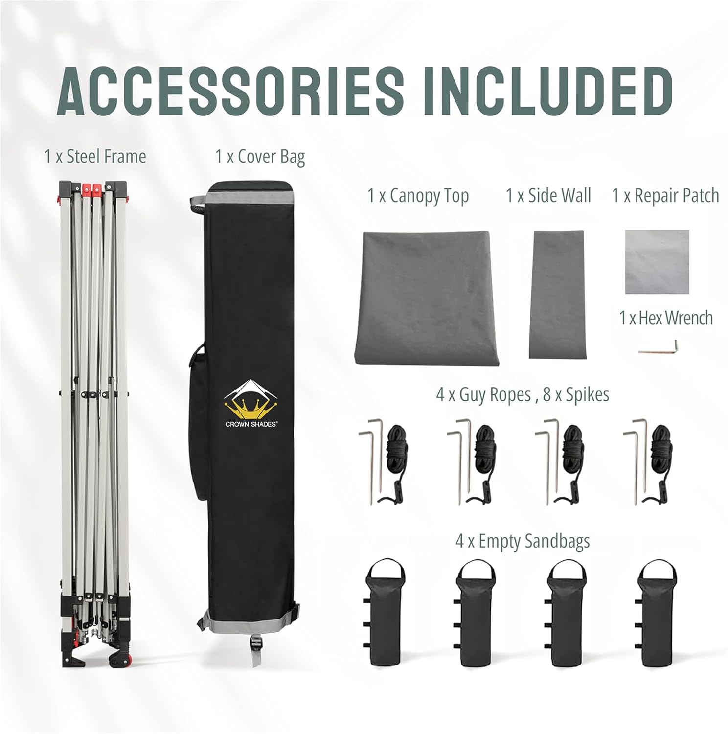 CROWN SHADES 12×12 Pop Up Canopy Tent Instant Commercial with 150D Silver Coated Fabric Including 1 Removable Sidewall, 4 Ropes, 8 Stakes, Weight Bags, STO ‘N Go Bag, Grid Grey