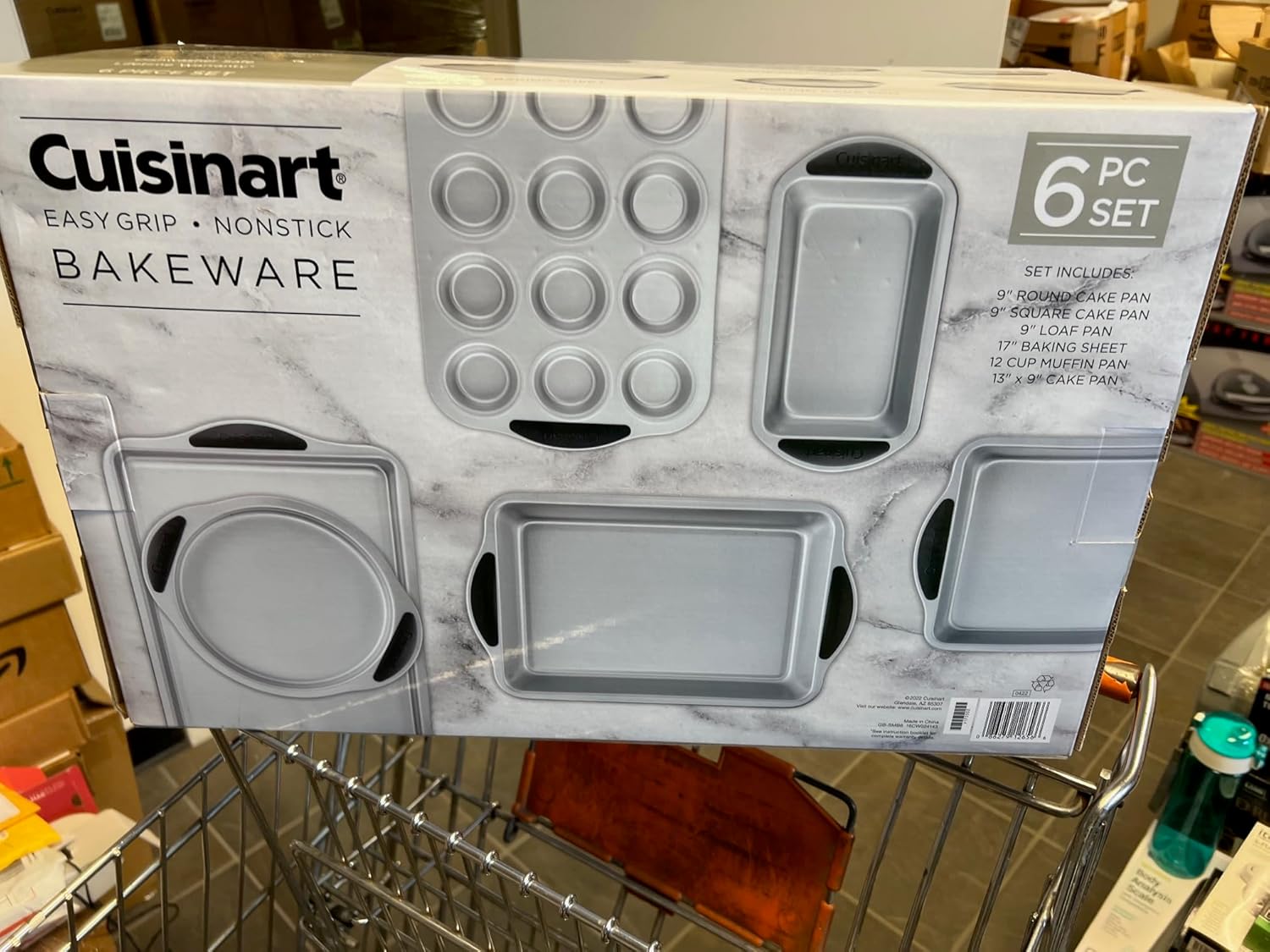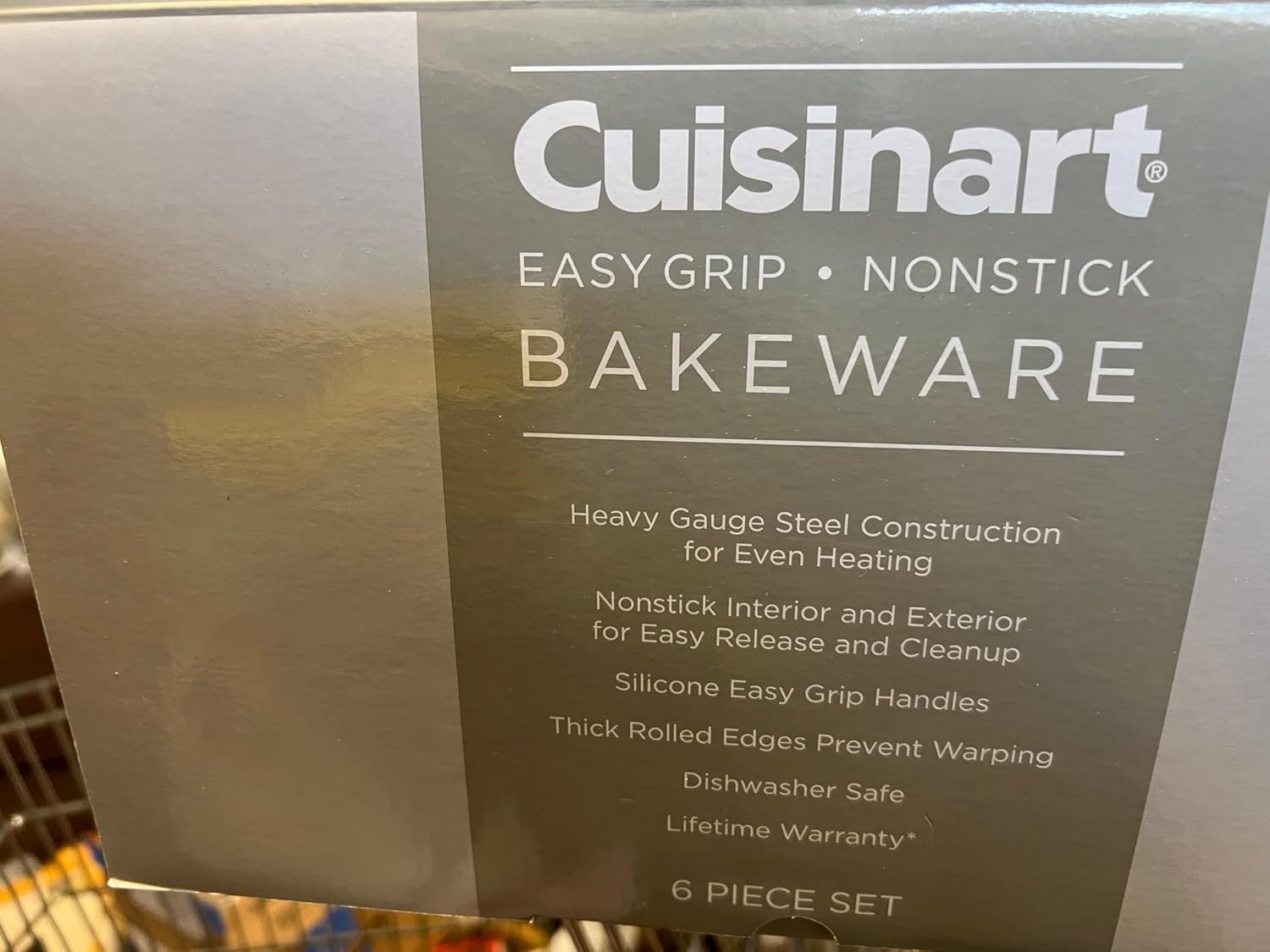 9′ SQURE CAKE PAN, 12 CUP MUFFIN PAN, 9’LOAF PAN,17’BAKING SHEET,9’ROUND CAKE PAN, 13’X9’CAKE PAN HEAVY GAUGE STEEL CONSTRUCTION,NONSTICK INTERIOR AND EXTERIOR SILICONE EASY GRIP HANDLES THICK ROLLED EDGES, DISHWASHER SAFE. 6 PIECE SET