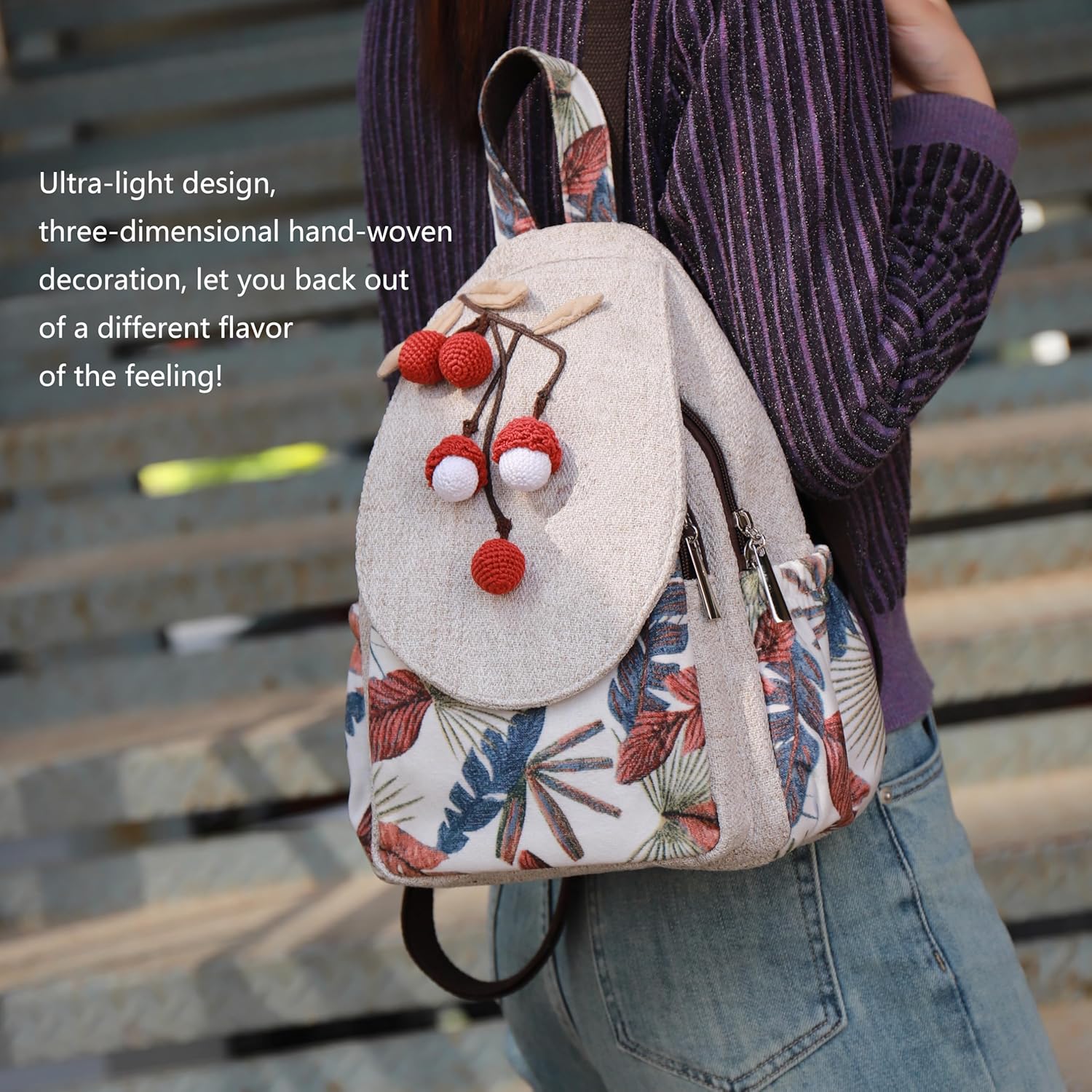 Cute personality women’s backpack, ladies’ canvas shoulder bag, hand-made original lychee art personality ultra-light multi-compartment small