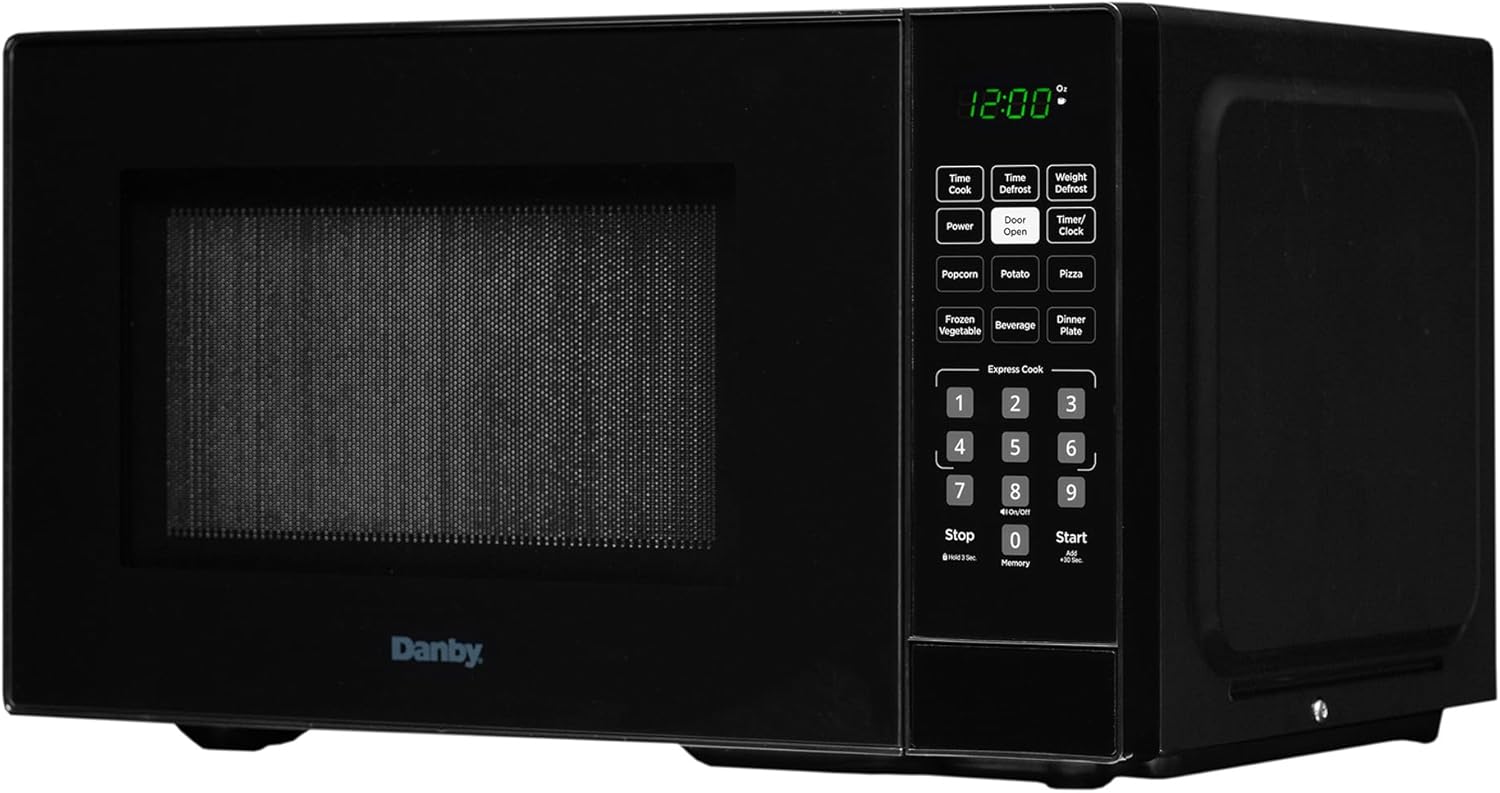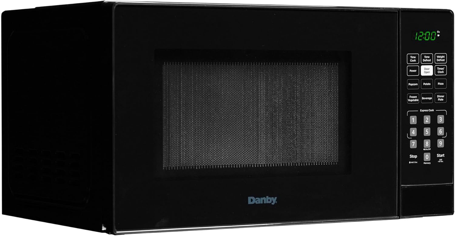 The Danby DBMW1126BBS 1.1 cu. ft. Countertop Microwave in Black combines sleek design with powerful performance. Its 1.1 cubic foot capacity and 1000 watts of power, along with 10 adjustable power levels, handle various cooking tasks. It features 6 auto cook options for Popcorn, Potato, Pizza, Frozen Vegetables, Beverage, and Dinner Plate, simplifying meal preparation. Express Cook buttons offer immediate cooking from 1 to 6 minutes, and the Add 30 Seconds function extends cooking time easily. Auto Defrost Options allow defrosting by time or weight for optimal results. The Time Cook feature provides precise control by manually setting cooking time. For safety, the Child/Control Lock Out option locks the control panel with a 3-second press of the STOP button and includes a 2-step door safety lock. A 12-month warranty on parts and labor with carry-in service offers peace of mind.