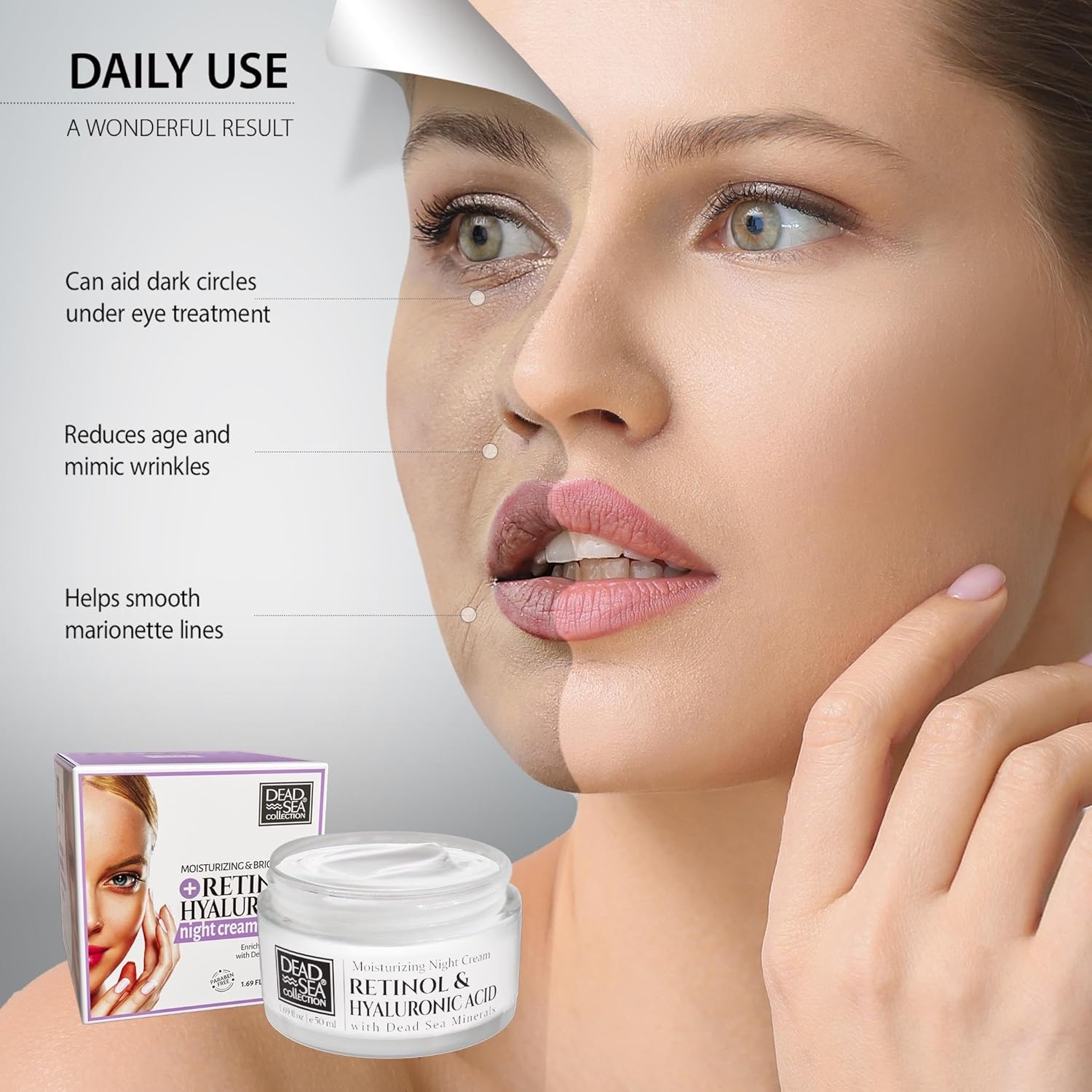 Dead Sea Collection Anti-Wrinkle Night Cream for Face with Retinol & Hyaluronic Acid – Nourishing and Moisturizer Face Cream (1.69 fl.oz/50ml) jar+box