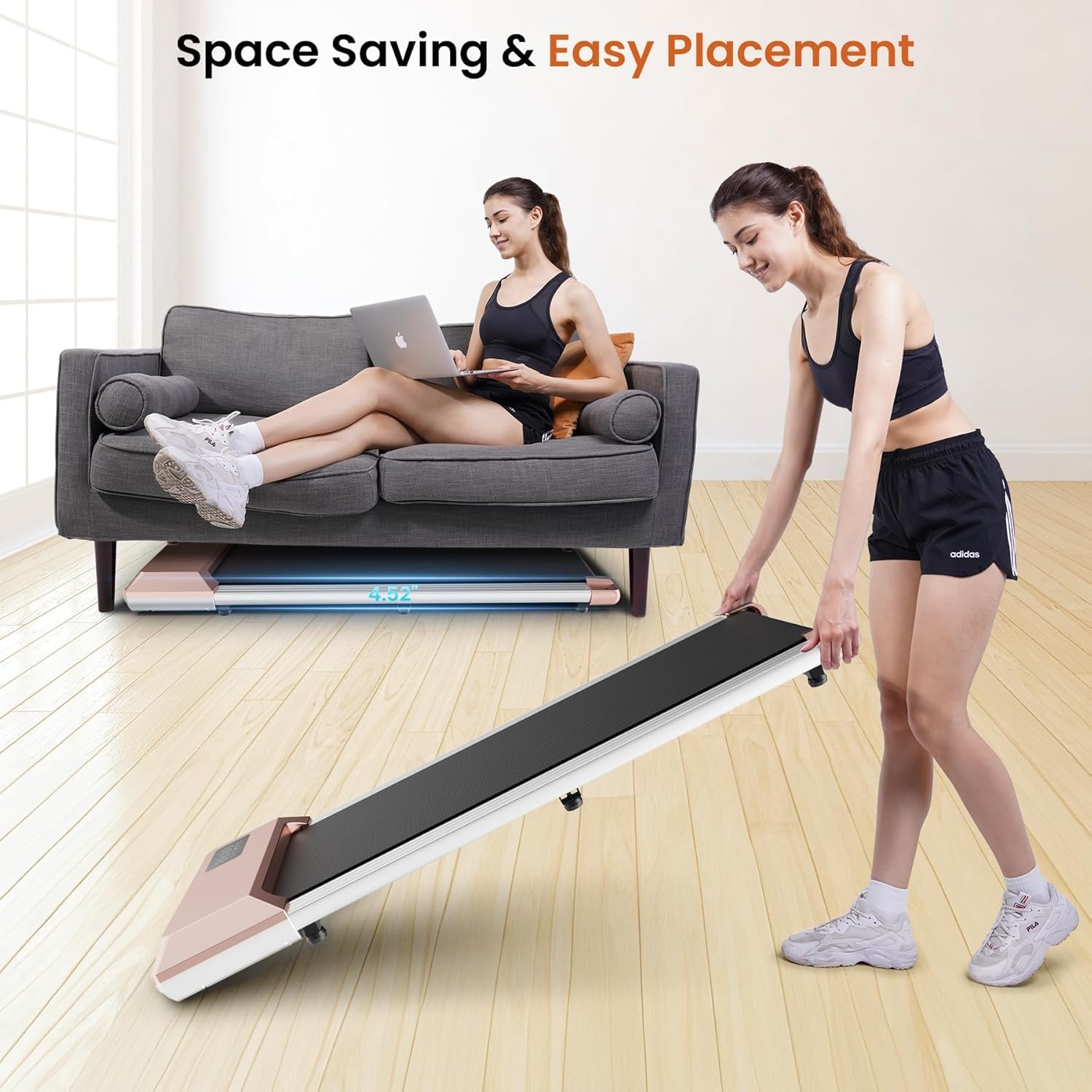 【EFFORTLESS MOBILITY WITH BUILT-IN WHEELS】Move the walking pad under desk treadmill easily with its built-in front wheels, providing flexibility to store or reposition it after use. This feature makes it perfect for users who need equipment that fits their space and lifestyle.