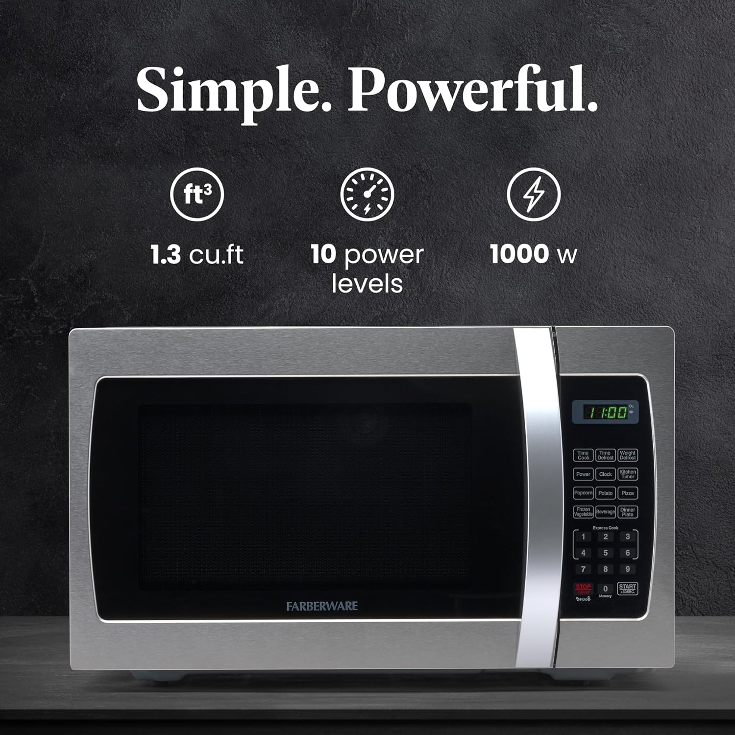 Farberware Countertop Microwave 1000 Watts, 1.3 Cu. Ft. – Microwave Oven With LED Lighting and Child Lock – Perfect for Apartments and Dorms – Easy Clean Stainless Steel