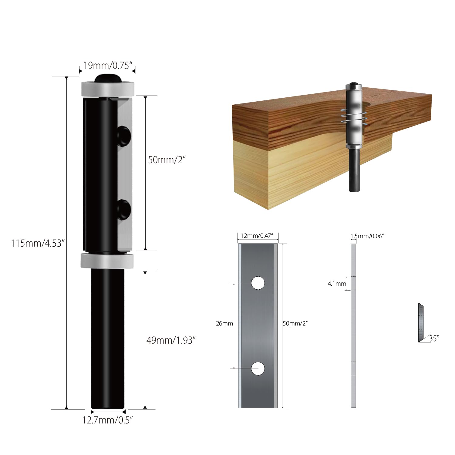 Size: Shank: 1/2” (12.7mm); Cut Diameter: 3/4″ (19mm); Cutting Length: 2″ (50mm); Carbide Inserts: 50x12x1.5mm. What You Get: 1/2” shank Flush Trim Router Bit *1; carbide insert*2; screw*4; screwdriver*1