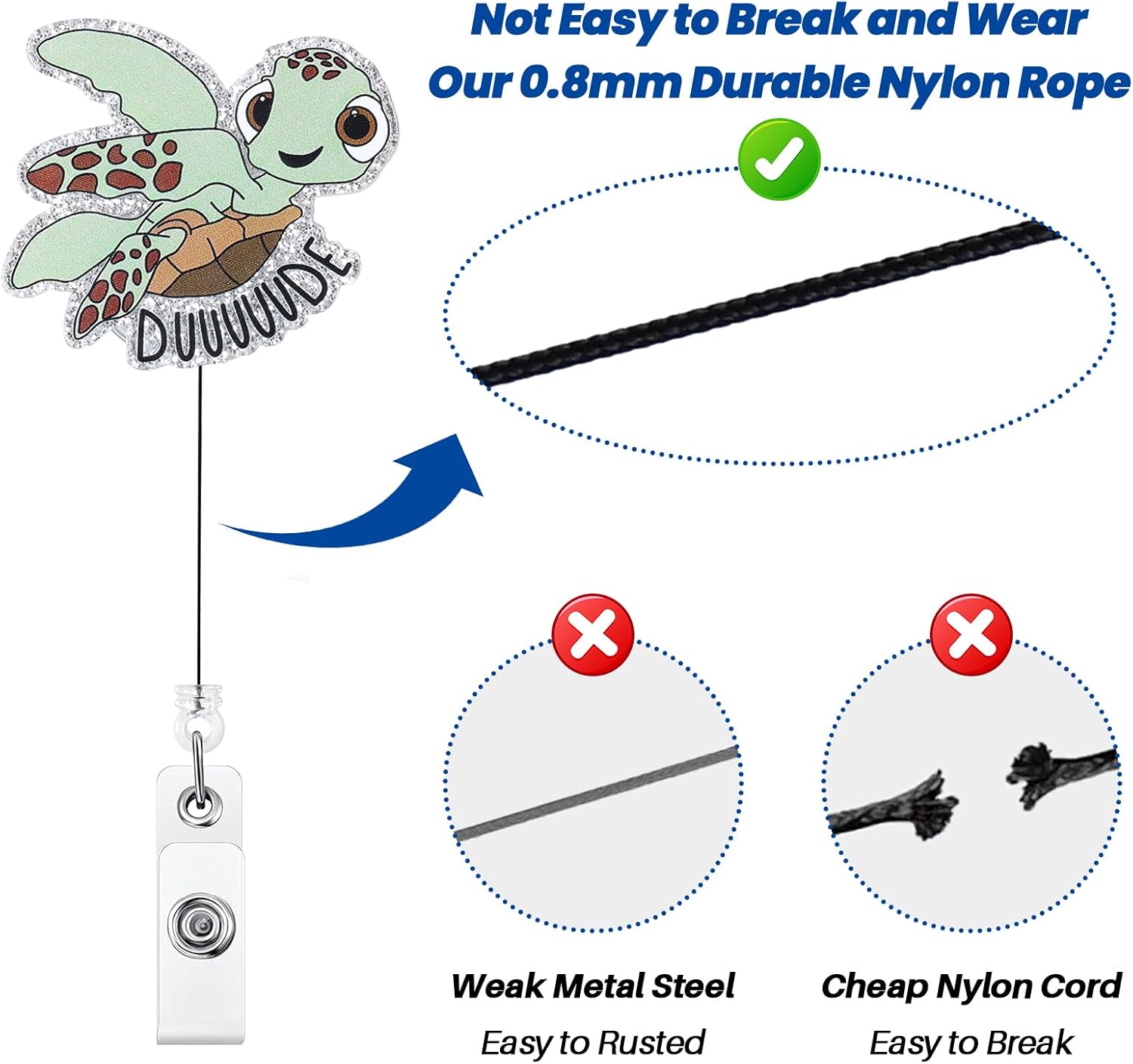 Handmade ID Badge Holder with Retractable Clip: The retractable alligator clip badge reel can be rotated 360 degrees, and the cord can automatically spring back.Strong Acrylic Material: This material is more durable than plastic. It is not fade and scratch-resistant.