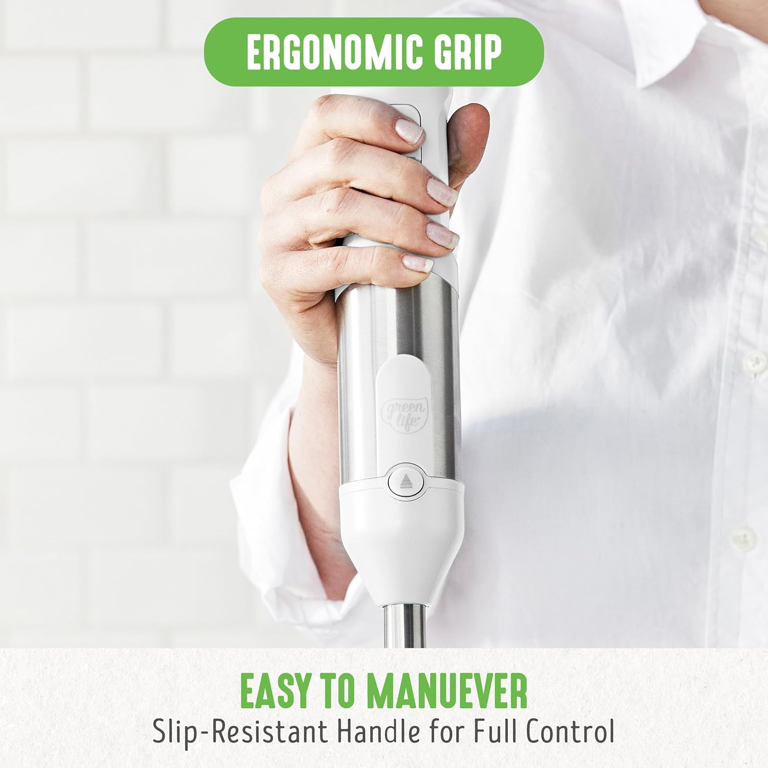 SLIP-RESISTANT HANDLE: The one handed ergonomic operation gives you a secure grip and total control as you blend.