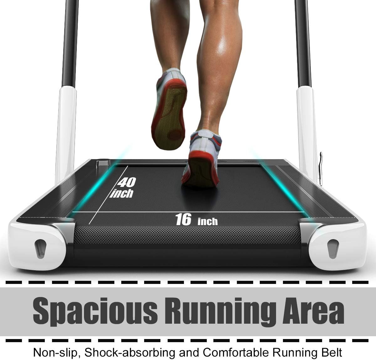 【2.25HP Quiet Motor & Shock-absorbing Design】With a powerful 2.25HP motor on the base, this premium treadmill will provide you with high intensity and silent exercise. The 5-layer shock-absorbing running belt provides an effective cushion for your joints and muscles.
