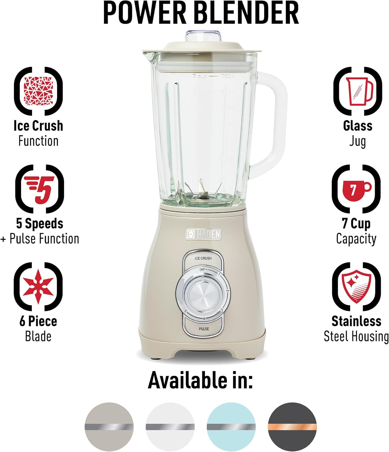 Haden Power Blender, 1.75 Liter Glass Jug, High Power 700W Motor, 5 Speed Settings, Pulse and Ice Crush Buttons, Stainless Steel, Putty/Chrome