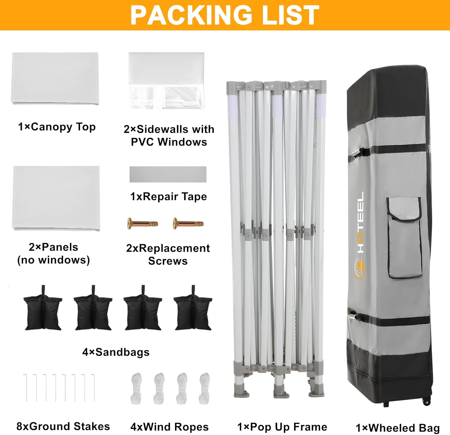 PACKING LIST & EASY SETUP: 1 x Pop Up Canopy Frame, 1 x Canopy Top Cover, 4 x PU Coated Panels (2 x Windows and 2 x Panels), 4 x Sandbags, 8 x Ground Nails, 4 x Wind Ropes, 1 x Wheeled Bag, 1 x Manual, 2 x Screws, 1 x Repair Tape. Simply take the fully assembled frame out of the bag, place the top canopy over it, stretch legs and done