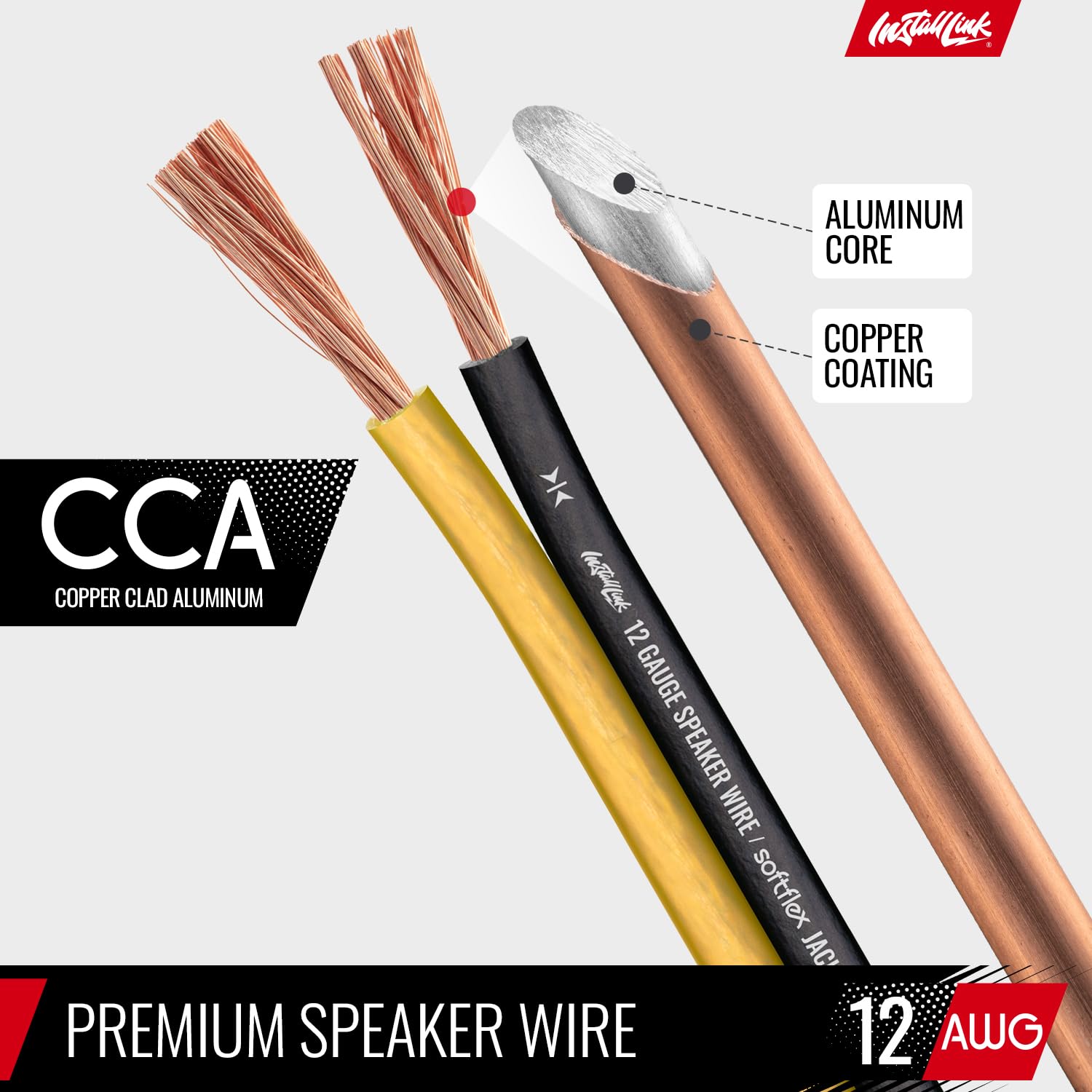 COPPER-CLAD ALUMINUM (CCA) – Made with an aluminum core and coated with a layer of copper, this cost effective speaker wire provides great conductivity with minimal signal loss.