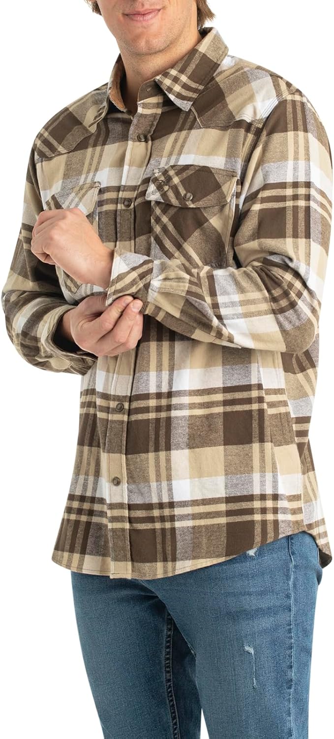 This Legendary plaid shirt features an exclusive Western flair design and was built for the hardworking man. A front-and-back yoke gets things started, embossed Legendary pearl snaps at the placket, cuffs, and twin snap closure chest pockets. Reinforced corduroy collar and cuffs finish it off in manly style. Completed with Legendary Signature Buck embroidery and triple-needle stitching. Warm, comfortable, brushed cotton flannel.