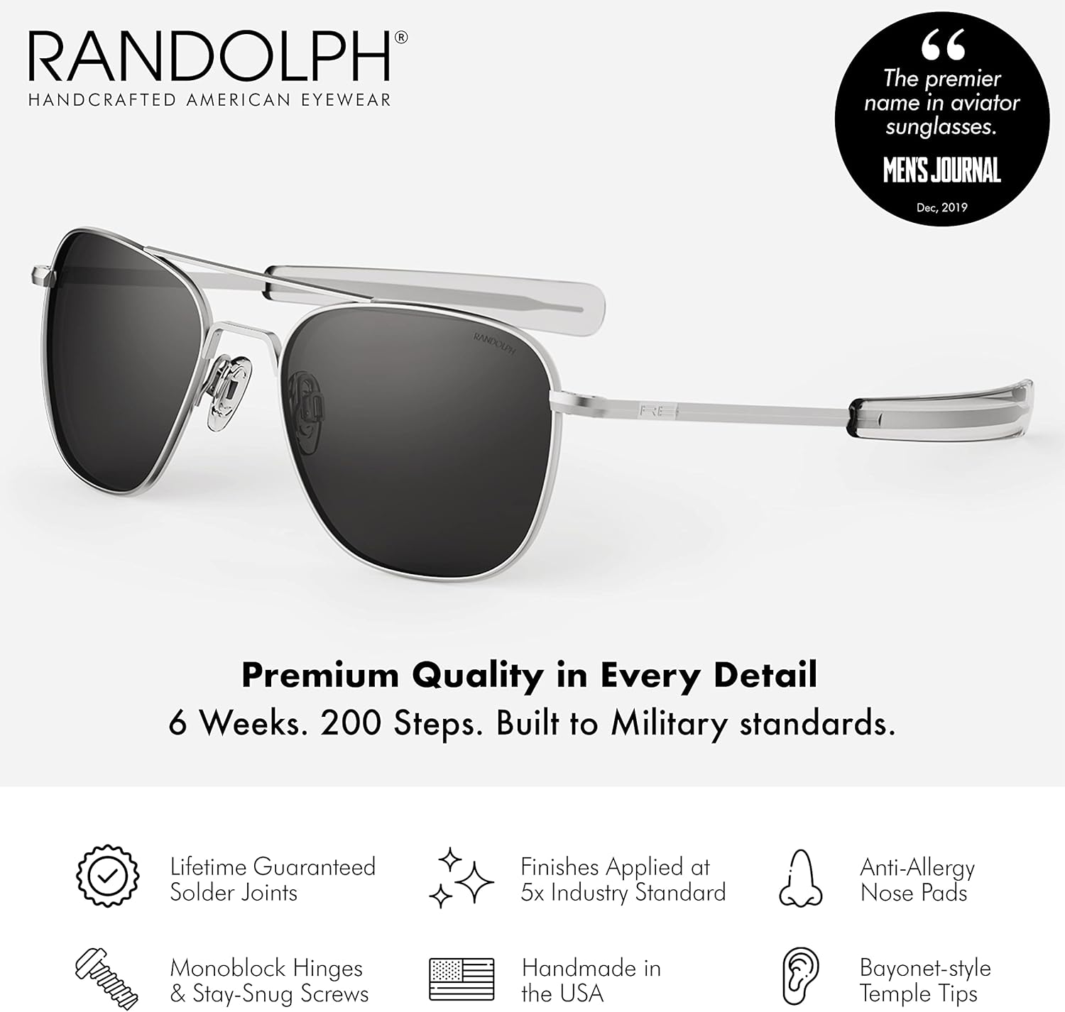 Mens or Womens Aviator Sunglasses, Matte Chrome, Classic, Polarized and Non-Polarized with UV Protection by Randolph USA