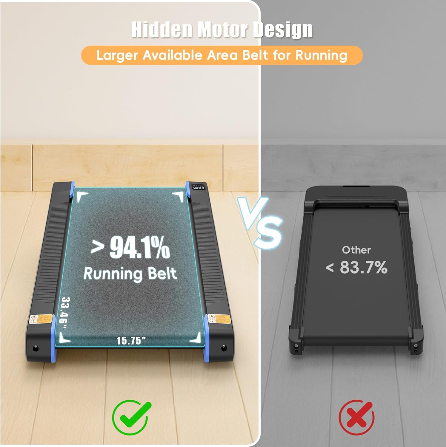 【Motor Hidden Design】 – Safer & Spacious: Enjoy a larger running belt area with our motor hidden design. This innovative feature eliminates the risk of tripping over the motor cover, providing a safer workout experience and ensuring you won’t fall due to stepping on the motor cover.