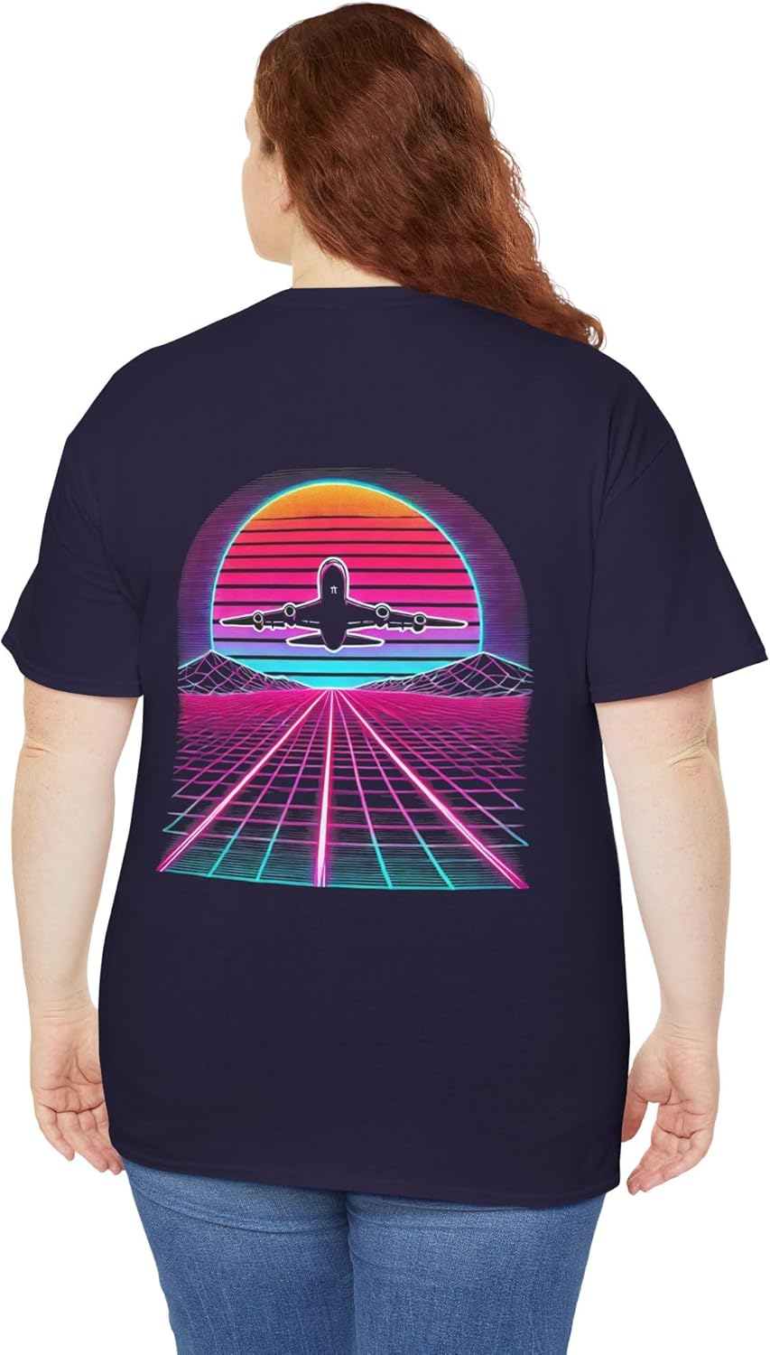 **Retro Aviation Vibes: Neon Flight T-Shirt** Step into the perfect blend of retro-futurism and aviation with this bold **Neon Flight T-Shirt**. Featuring a vibrant design of an airplane ascending through a glowing synthwave grid and sunset, this shirt is an ideal choice for aviation enthusiasts, retro lovers, and fans of unique, bold fashion. **Why You’ll Love This Shirt:** – **Striking Design:** The vivid neon colors, geometric grid, and sunset background bring a nostalgic yet futuristic style to your wardrobe. – **Premium Comfort:** Crafted from high-quality, soft, and breathable fabric for all-day wear. – **Unisex Fit:** Designed to flatter everyone, available in a variety of sizes to suit your style. – **Durable Quality:** Fade-resistant print ensures the design stays vibrant wash after wash. – **Versatile Style:** Perfect for casual outings, aviation events, or making a bold fashion statement. **For Dreamers and Flyers** Celebrate the thrill of flight and retro aesthetics with this standout t-shirt. Whether you’re gifting it to an aviation lover or adding it to your collection, this shirt is a timeless piece for anyone who dreams of soaring higher. *Order now and let your style take flight!*