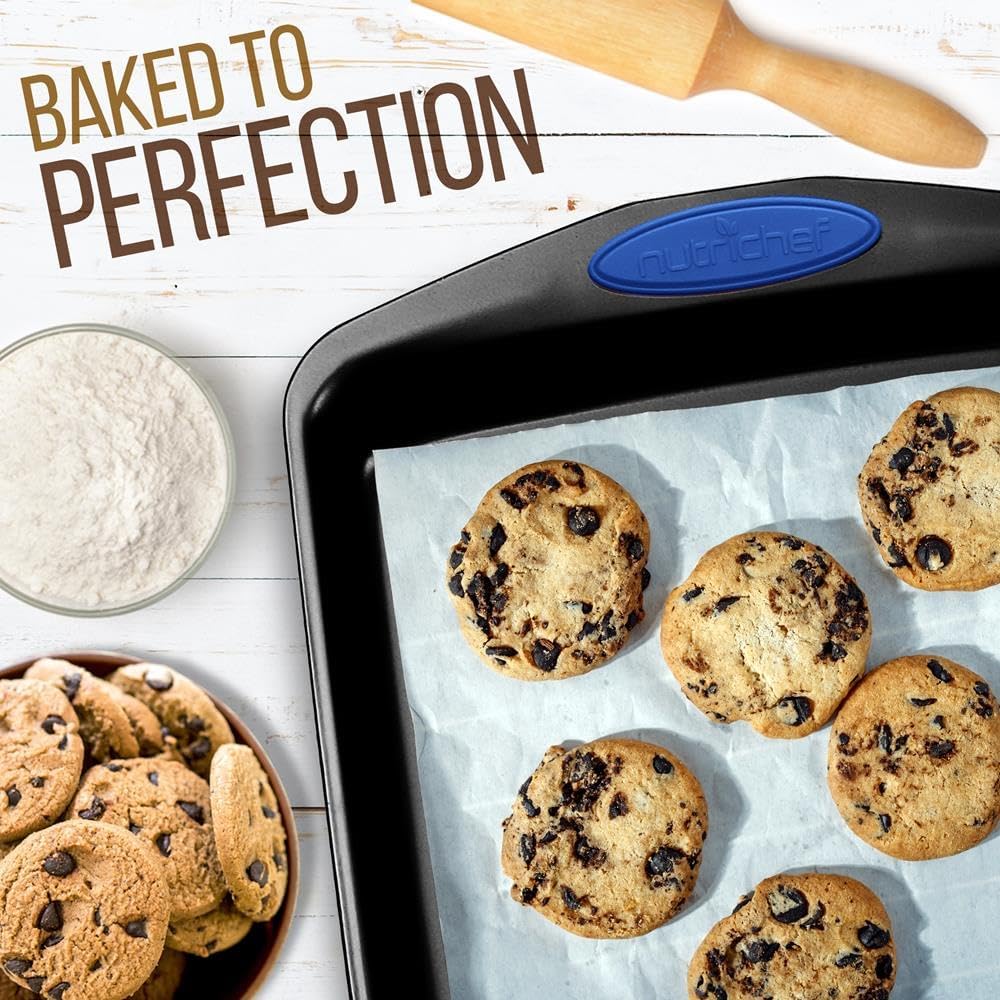 NutriChef 15-Piece Baking Pan Set – PFOA, PFOS, PTFE Free Flexible Nonstick Gray Coating Carbon Steel Bakeware – Professional Home Kitchen Bake Cookie Sheet Stackable Tray w/Blue Silicone Handles