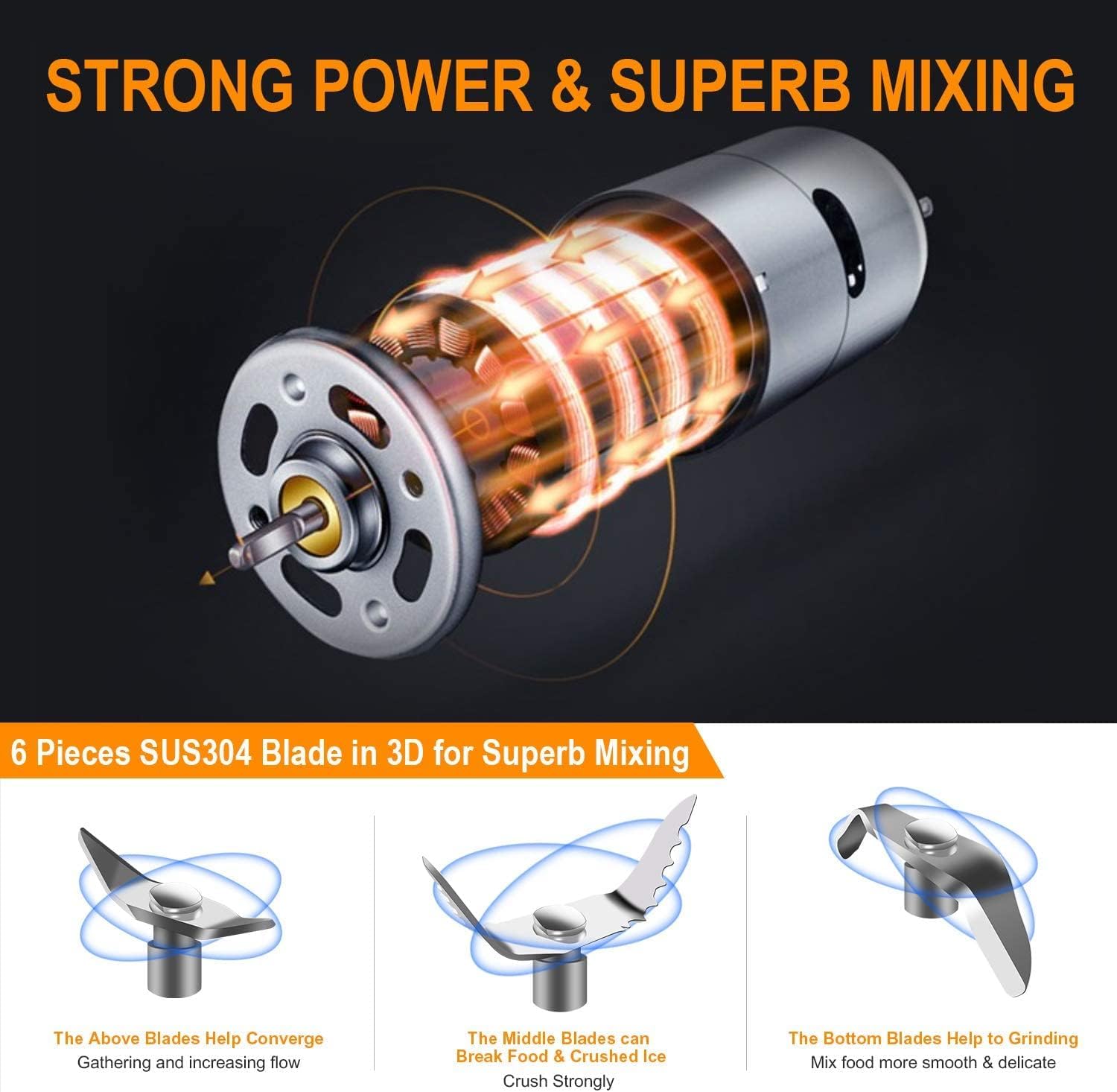 PORTABLE and POWERFUL:This personal blender is compact and very portable,with its 20,000 RPM and 6 sharp stainless steel blades,it allows you to makes it easy to quickly make the delicious smoothies and juices you want while you’re on the go or at the gym
