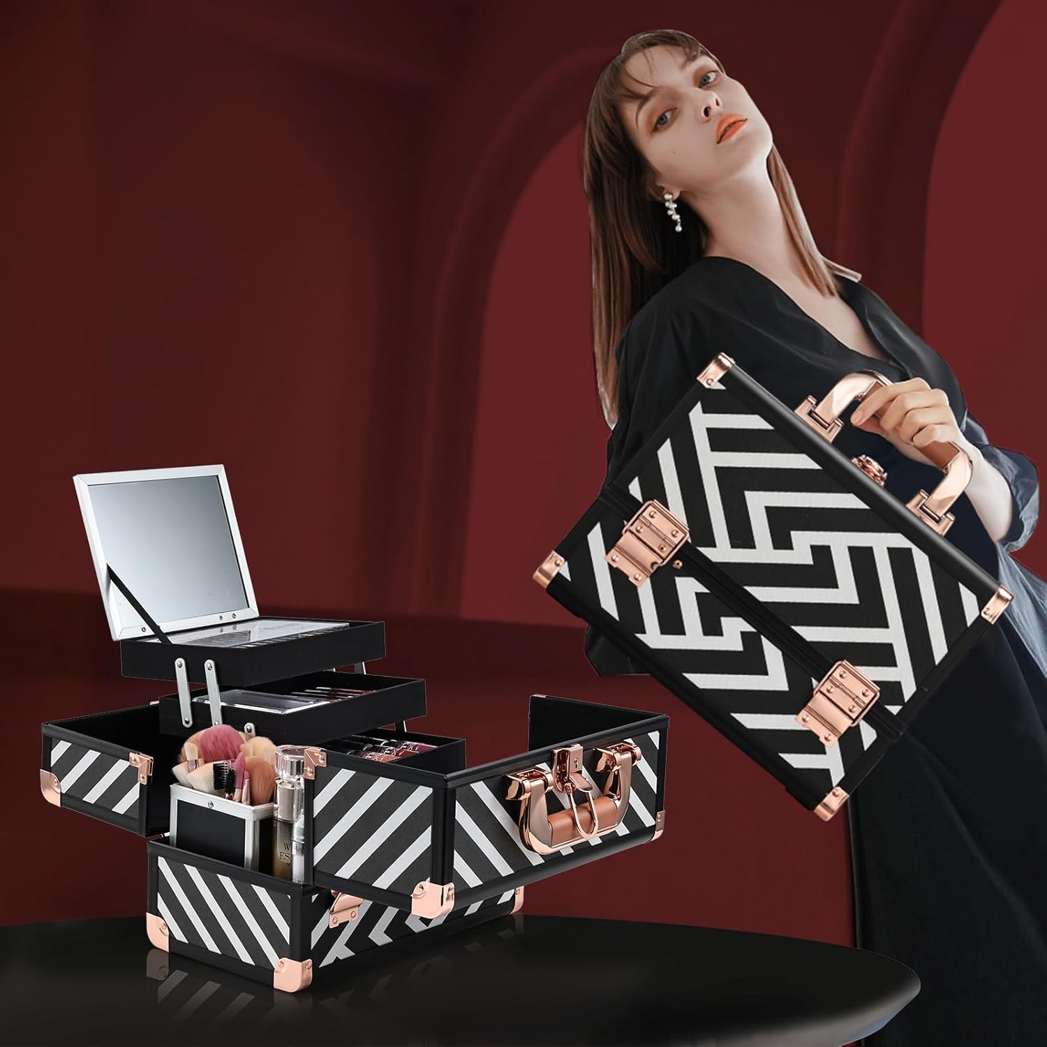 Professional Makeup Case Train Case, 11.6 Inch Extra Large Makeup Box, 3-Tier Trays with Mirror Travel Cosmetic Organizer with Brush Holder, Lockable with Keys, Vintage Stripe