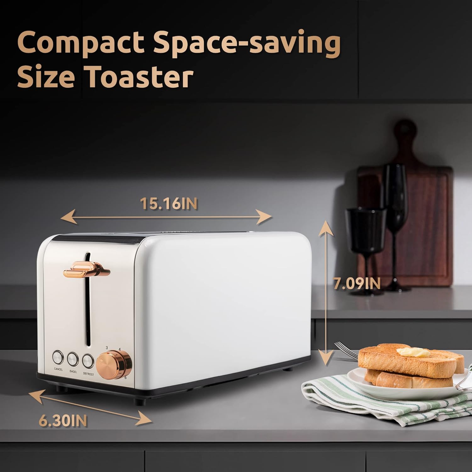 【EXTRA LONG&WIDE SLOT】 – With 10.5″ long and 1.5″ wide Slot you can toasting 4 slices of bread at once, fit long, thick slices of bread, Texas toast, bagels, English muffins, the long shape saves counter space in the kitchen and blends in well with appliances