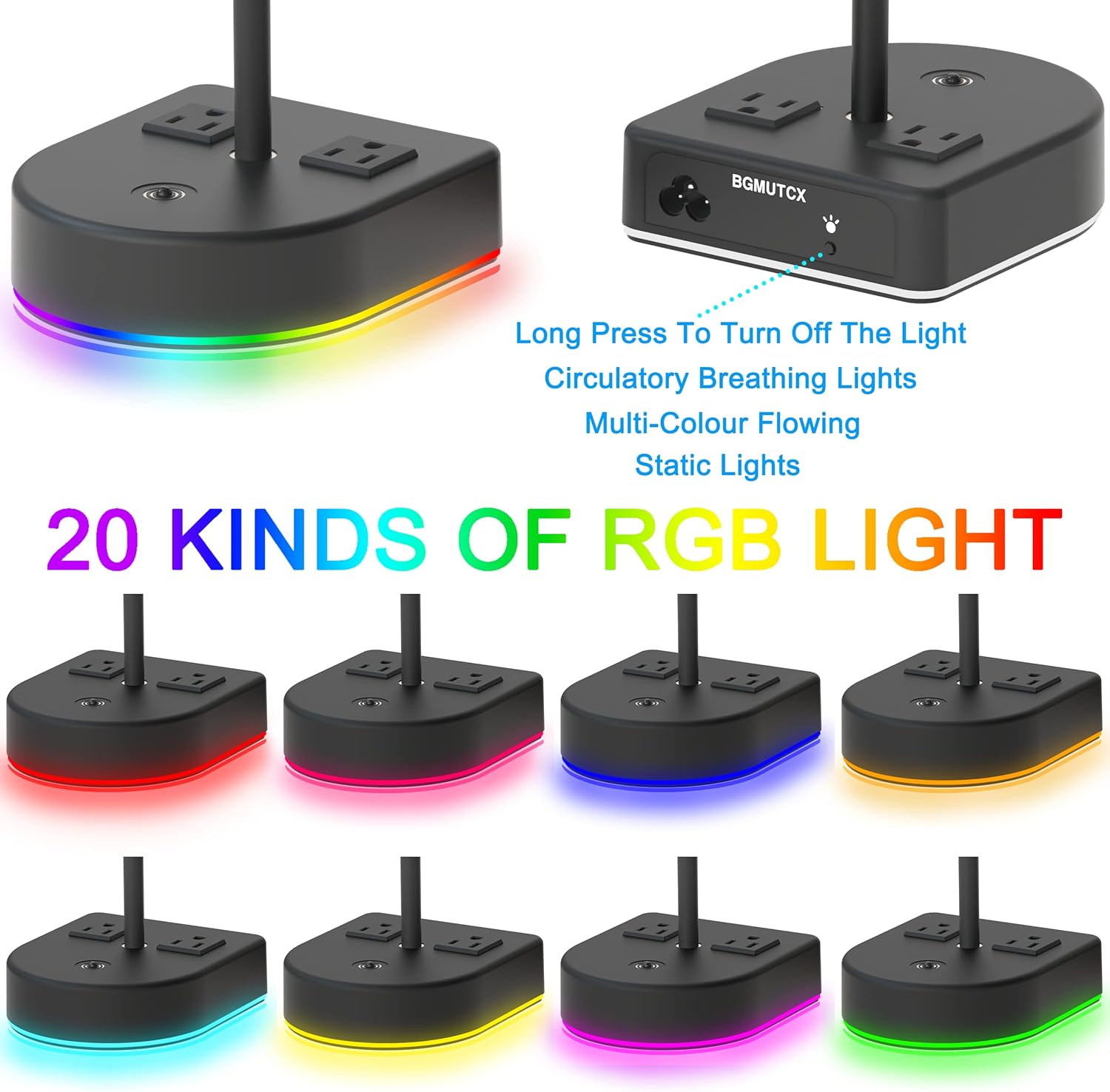 【RGB Lighting】This Rgb Headset Holder A Total Of 11 Kinds Of Light Mode Switching,Multi-Color Flowing Lights, Monochrome Lights, Breathing Lights, One Button For Easily Selecting Light Mode And Turn Off,Long Press The Switch To Turn Off Lights, and it will remember your light settings after turning off the light, You Can Switch Light Effects According To Your Preferences.