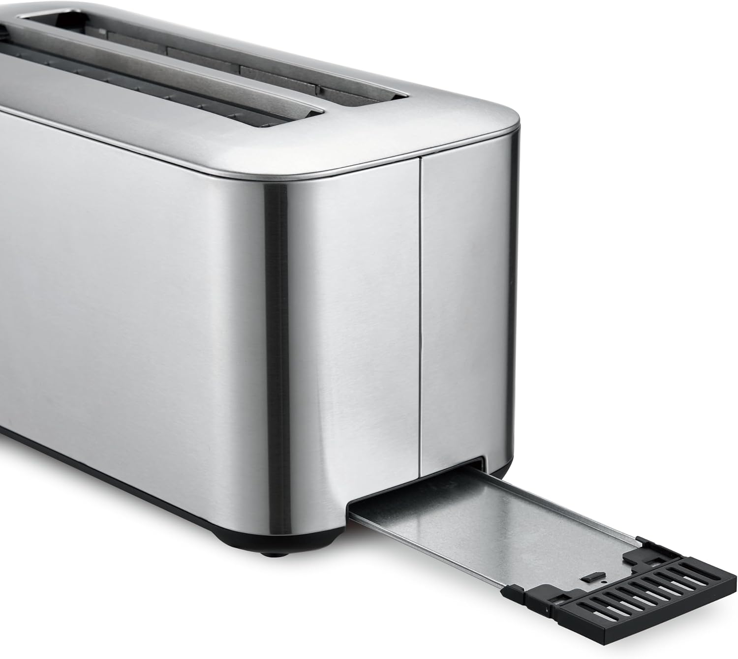 𝗦𝗣𝗔𝗖𝗘-𝗦𝗔𝗩𝗜𝗡𝗚 𝗗𝗘𝗦𝗜𝗚𝗡 𝗪𝗜𝗧𝗛 𝗘𝗔𝗦𝗬 𝗖𝗟𝗘𝗔𝗡-𝗨𝗣 – Compact, modern stainless design saves counter space, while the slide-out crumb tray and anti-jam safety shut-off make cleaning and operation simple and safe