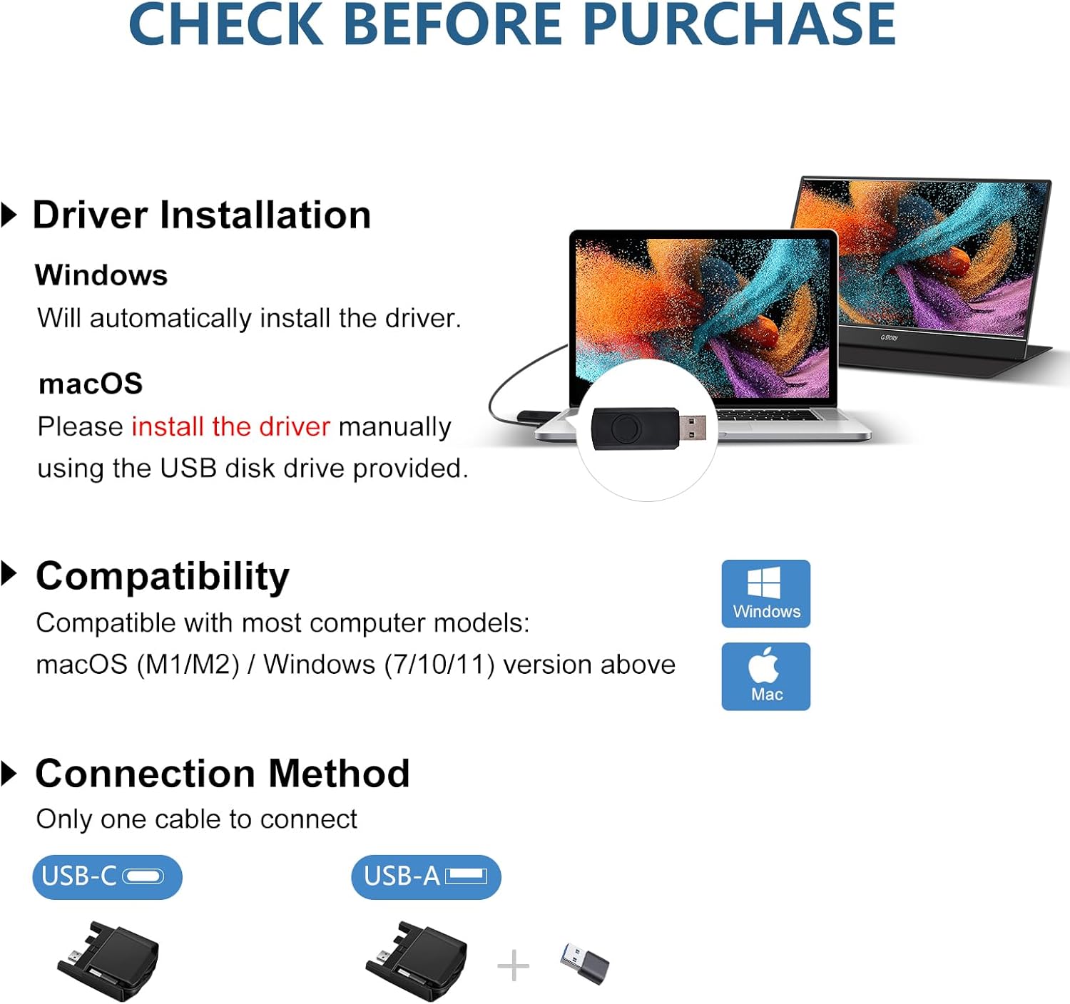 [Note Before Purchase] For macOS, please use the provided USB disk drive to install the driver. Windows systems typically install the driver automatically. If you experience issues such as showing “waiting computer connect”/screen flickering/black screen, please use the USB disk drive provided to install the corresponding drivers or change a cable. If the problem is not resolved, please let us know.