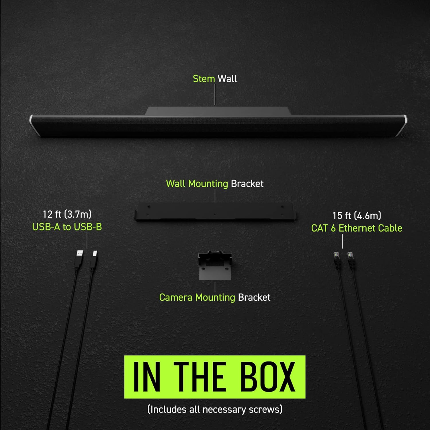 WHAT’S IN THE BOX – 1 Stem Wall, 1 USB Type A to USB Type B Cable: 12 ft. (3.7 m), 1 CAT 6 Ethernet Cable: 15 ft. (4.6 m), 1 Wall Mounting Kit, 1 Camera Mount Kit.