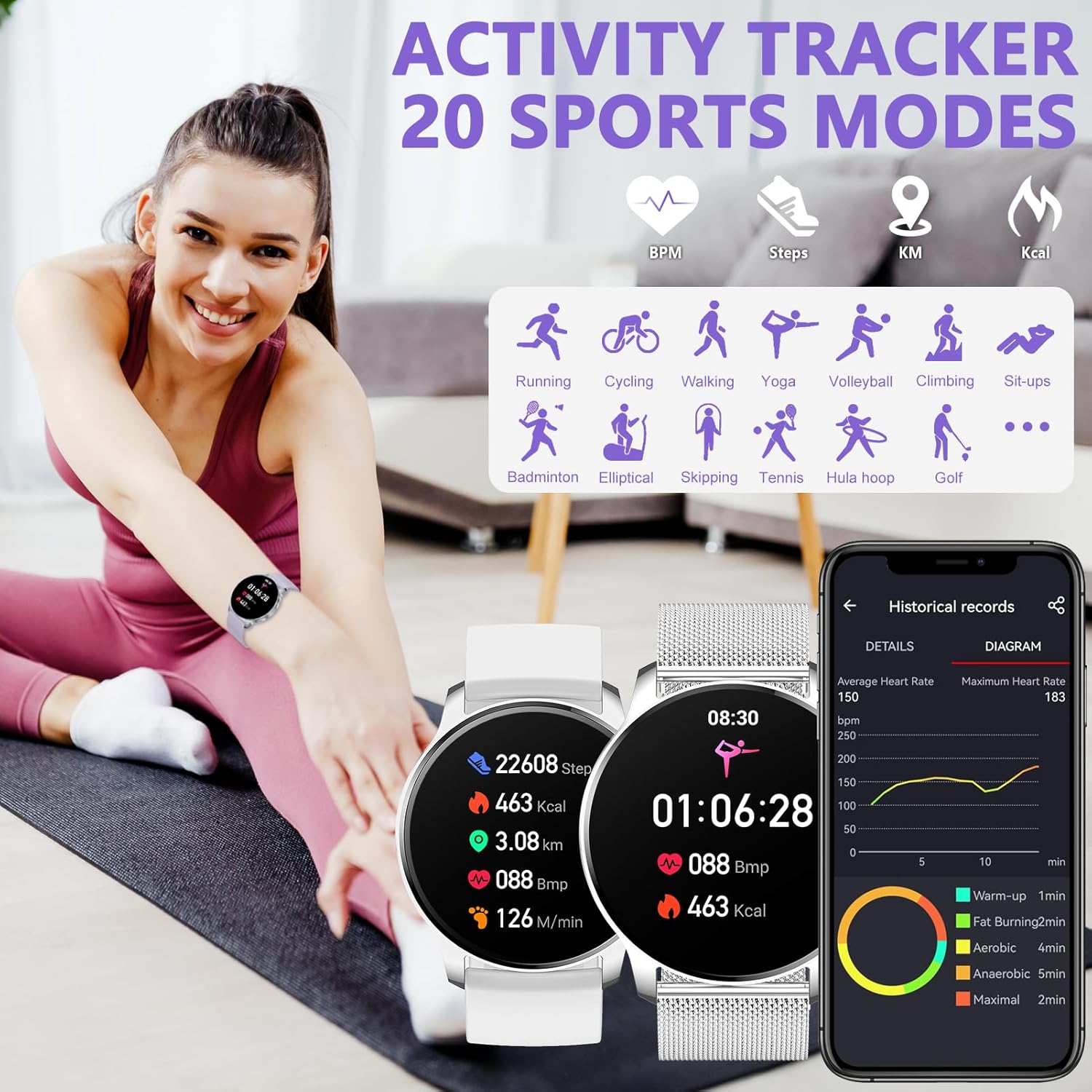 ACTIVITY TRACKER & 20 SPORTS MODES: Fitness tracker for women with sport optical sensors detects and records all-day activities such as steps, calories, and distances. The fitness watch for women also supports 20 sports modes(walking, running, yoga, cycling, climbing, etc.) and tracks heart rate, calorie consumption, steps, and active minutes during a workout. You can see more detailed data on the App to help you reach your fitness goals. The best choice for sports enthusiasts
