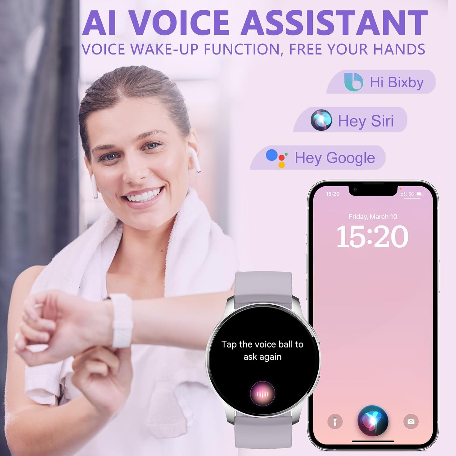 BLUETOOTH CALL & SMART NOTIFICATIONS: Smart watches for women with a microphone and speaker, you can make and receive calls with clarity, keeping in touch with your family and friends. Smart watch with text and calls will vibration to alert you when it receives SMS, and SNS notifications(Instagram, Twitter, Facebook, etc.)Never miss a notification or call again. Your phone’s AI voice assistant can be controlled through the smartwatch