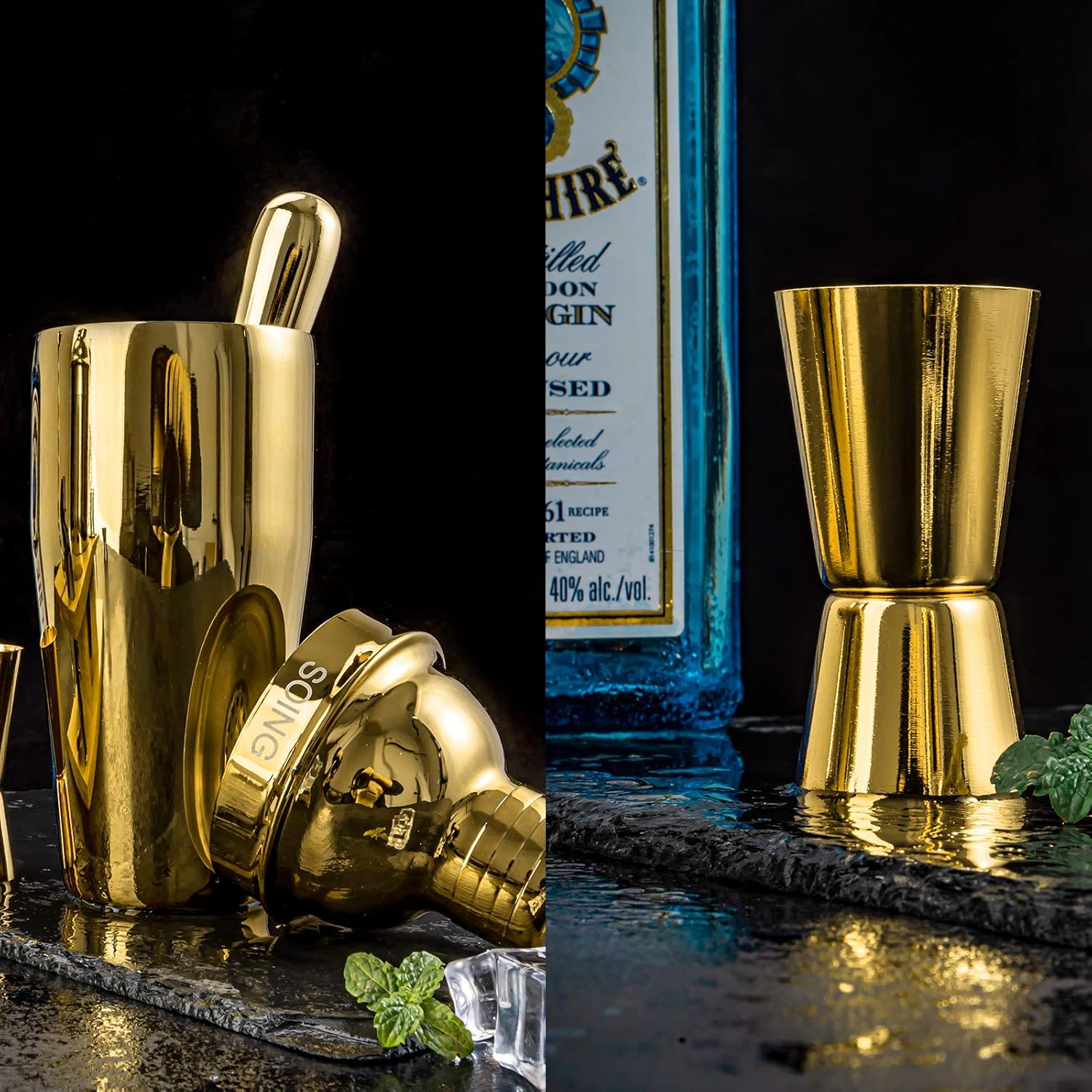 Soing 11-Piece Gold Bartender Kit,Perfect Home Cocktail Shaker Set for Drink Mixing,Stainless Steel Bar Tools with Stand,Velvet Carry Bag & Cocktail Recipes Cards (Gold)